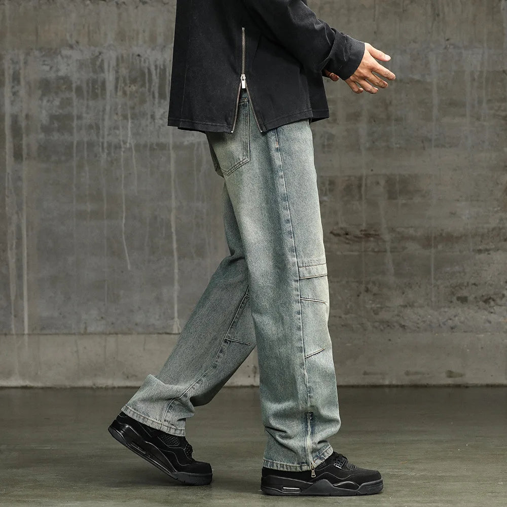 BONSIR - American New Fashion Vintage Men's Straight Wide Leg Loose Spliced Casual Trendy Washed Blue Denim Trousers Male Streetwear