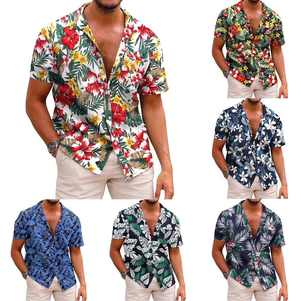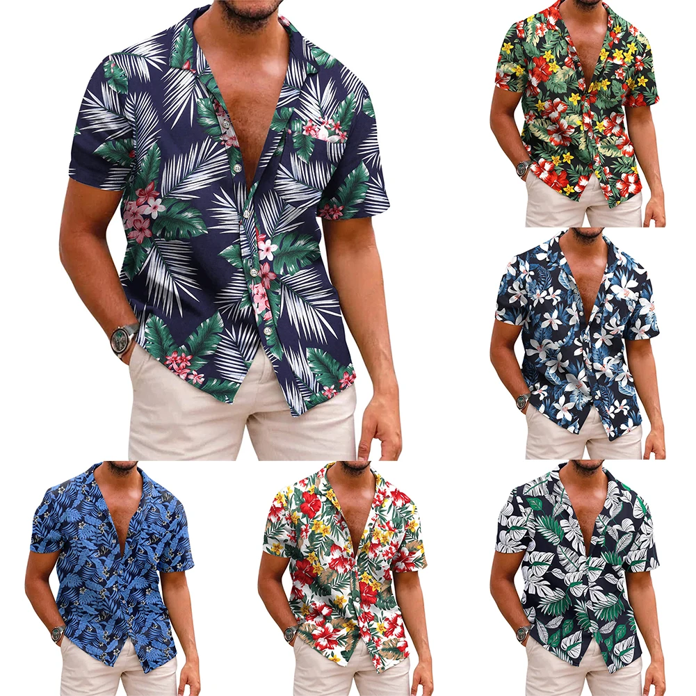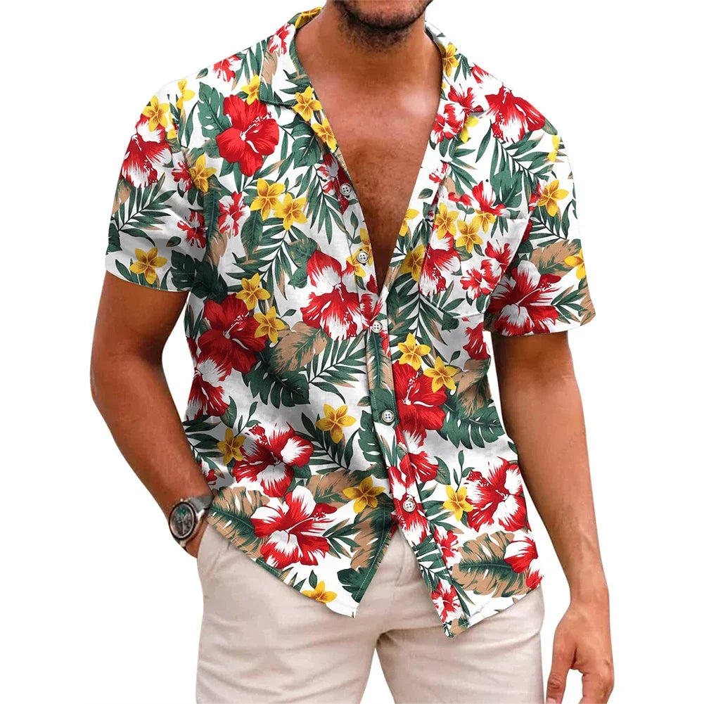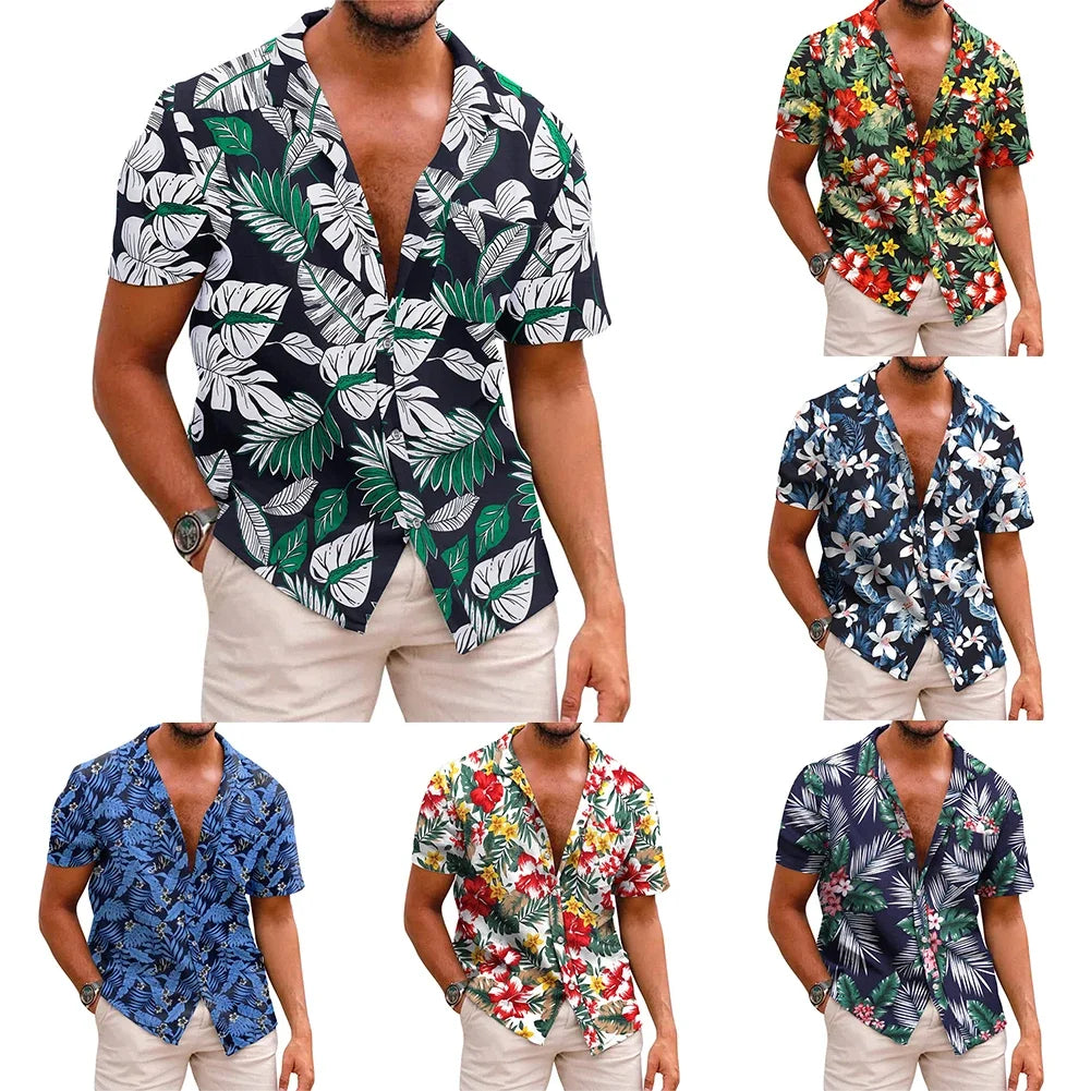 BONSIR - Casual Top Shirt Men Regular Short Sleeve Slight Stretch Summer Vacation 3D Print Blouse Button Daily Brand New