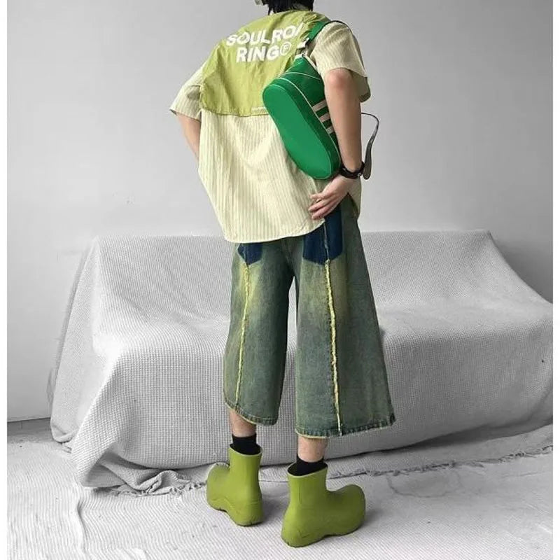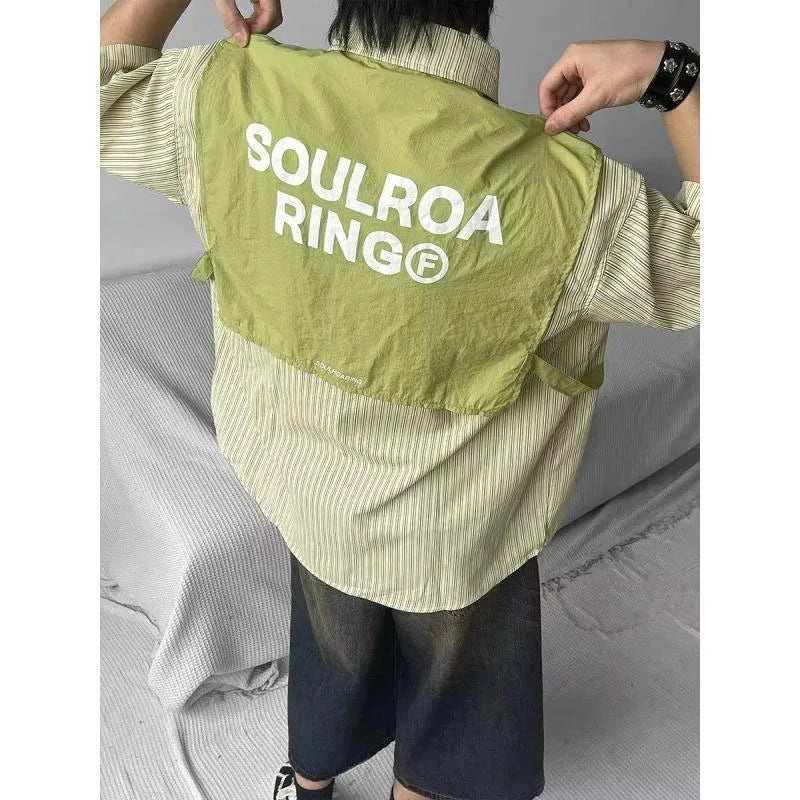 BONSIR - Fake Two Pieces Summer New Men's Turn-down Collar Button Spliced Pockets Striped Letter Shirt Short Sleeve Trendy Loose Tops