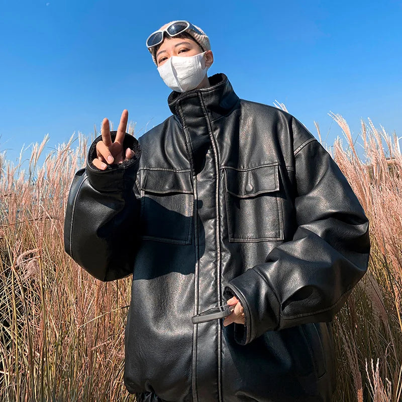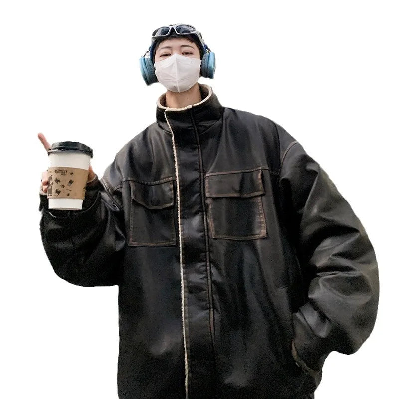 BONSIR - Fur integrated cotton jacket men's bomber jacket winter American retro lamb velvet thickened velvet motorcycle cotton jacket