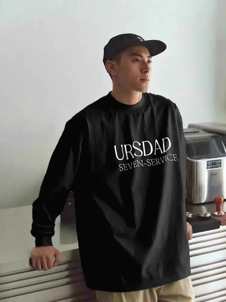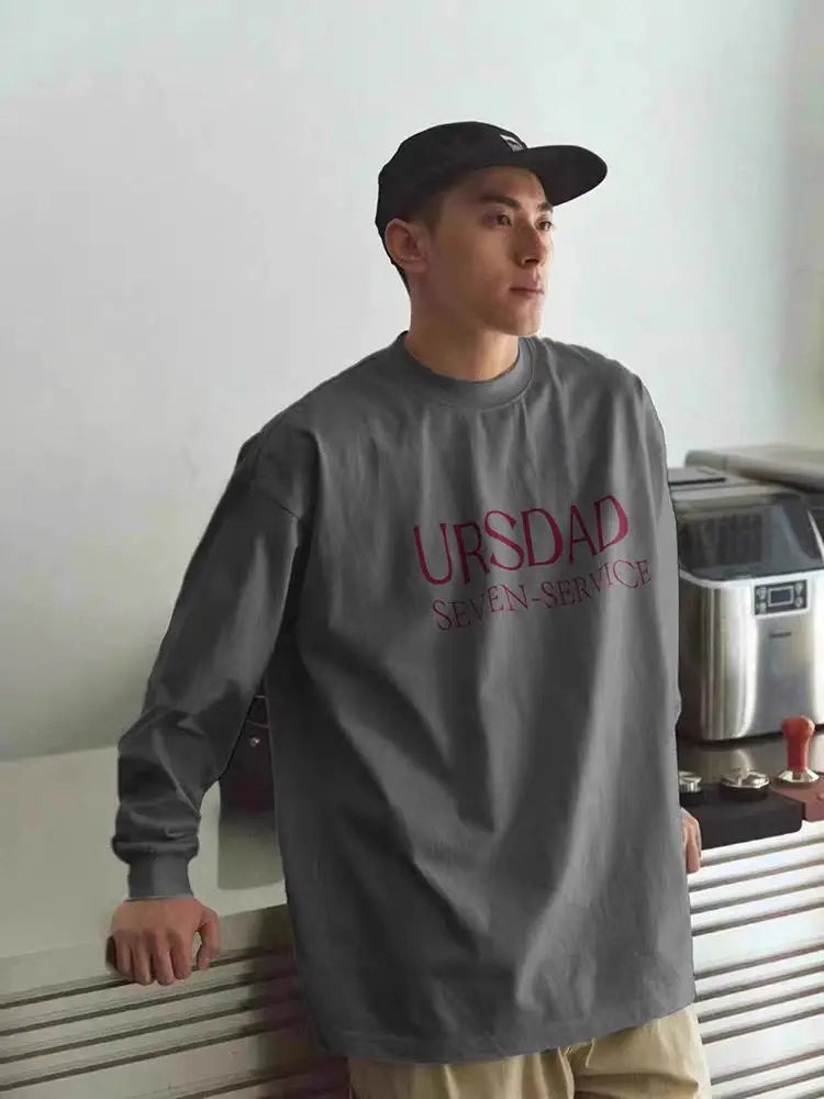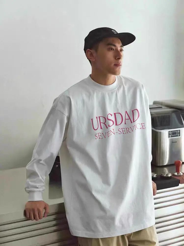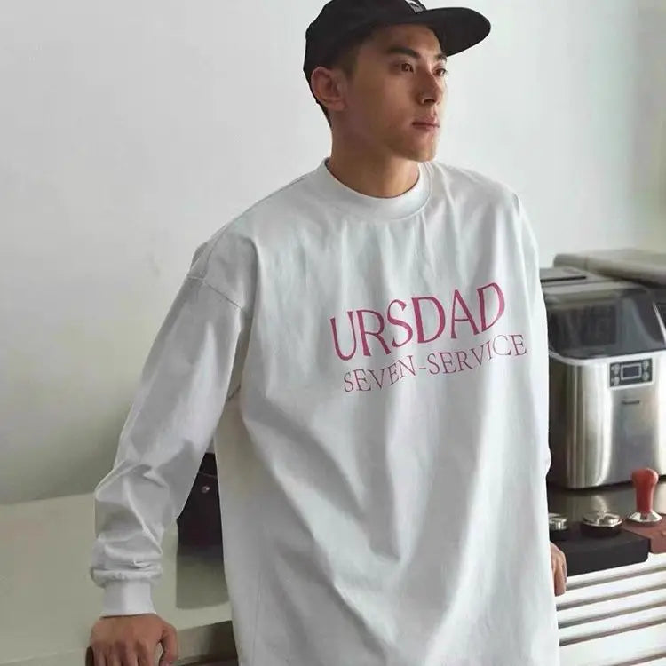 BONSIR - Heavy cotton Japanese street printed long-sleeved T-shirt for men in autumn loose and simple small neckline inner t-shirt
