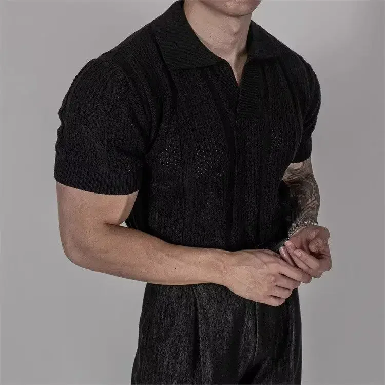BONSIR  -  Knitted Strands of Empty Short-sleeved POLO Shirt T-shirt Men's Mesh Top