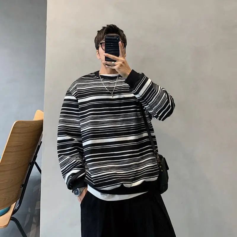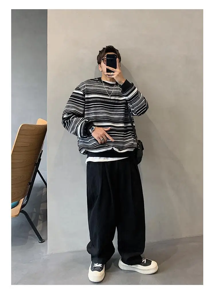 BONSIR - large-size men's autumn and winter Japanese retro striped velvet thickened American round neck pullover sweatshirt