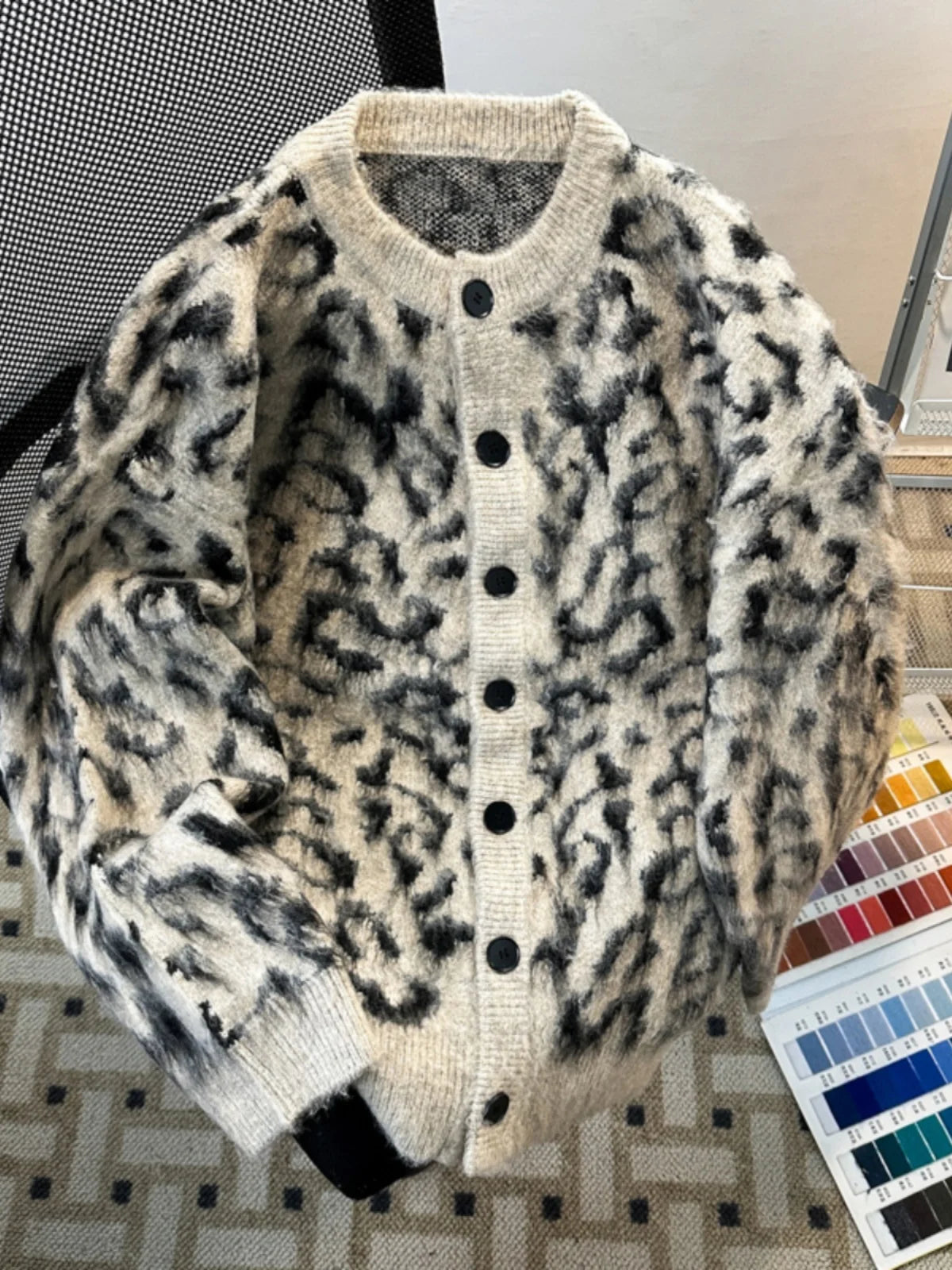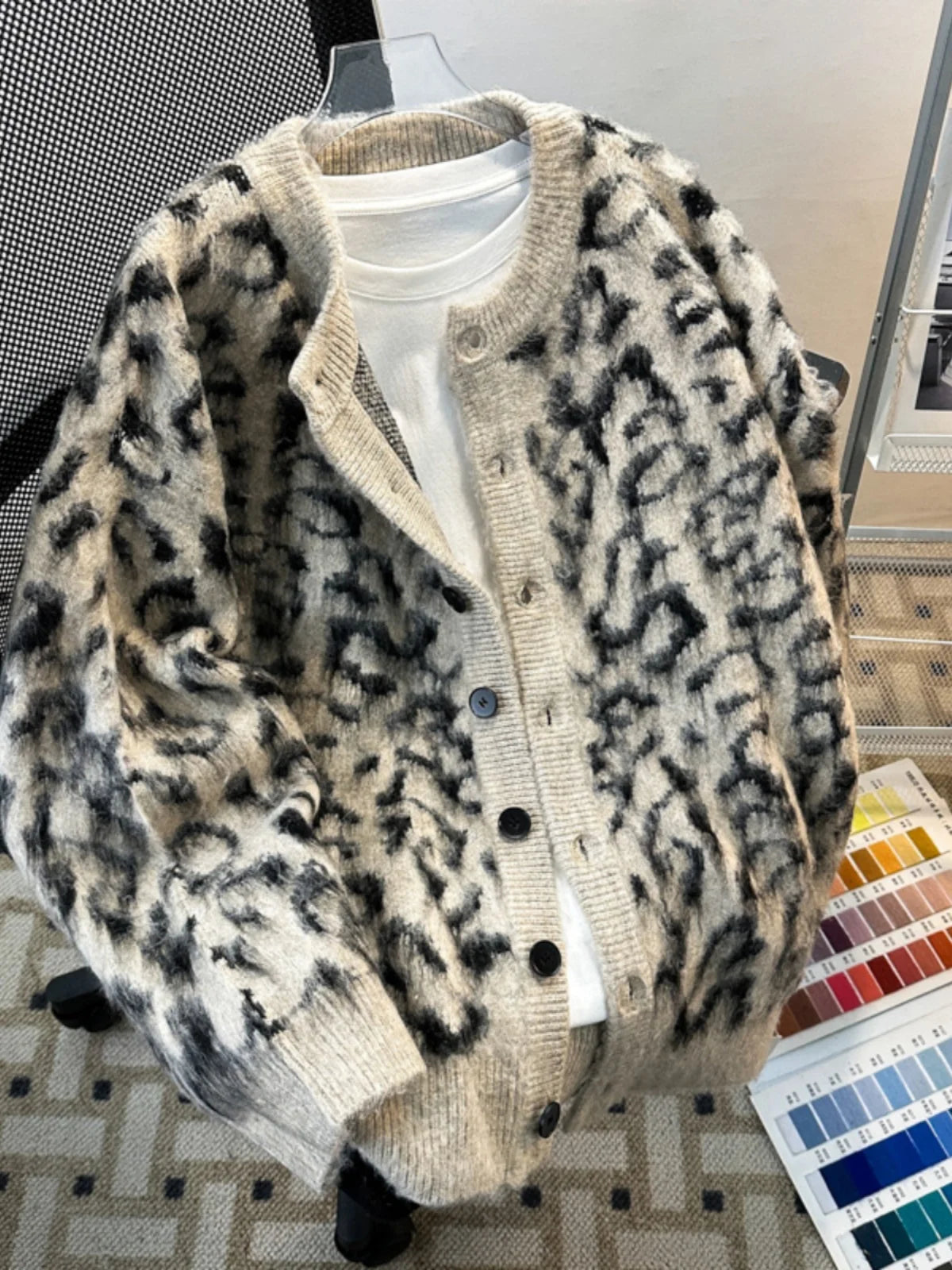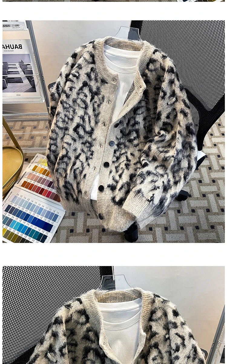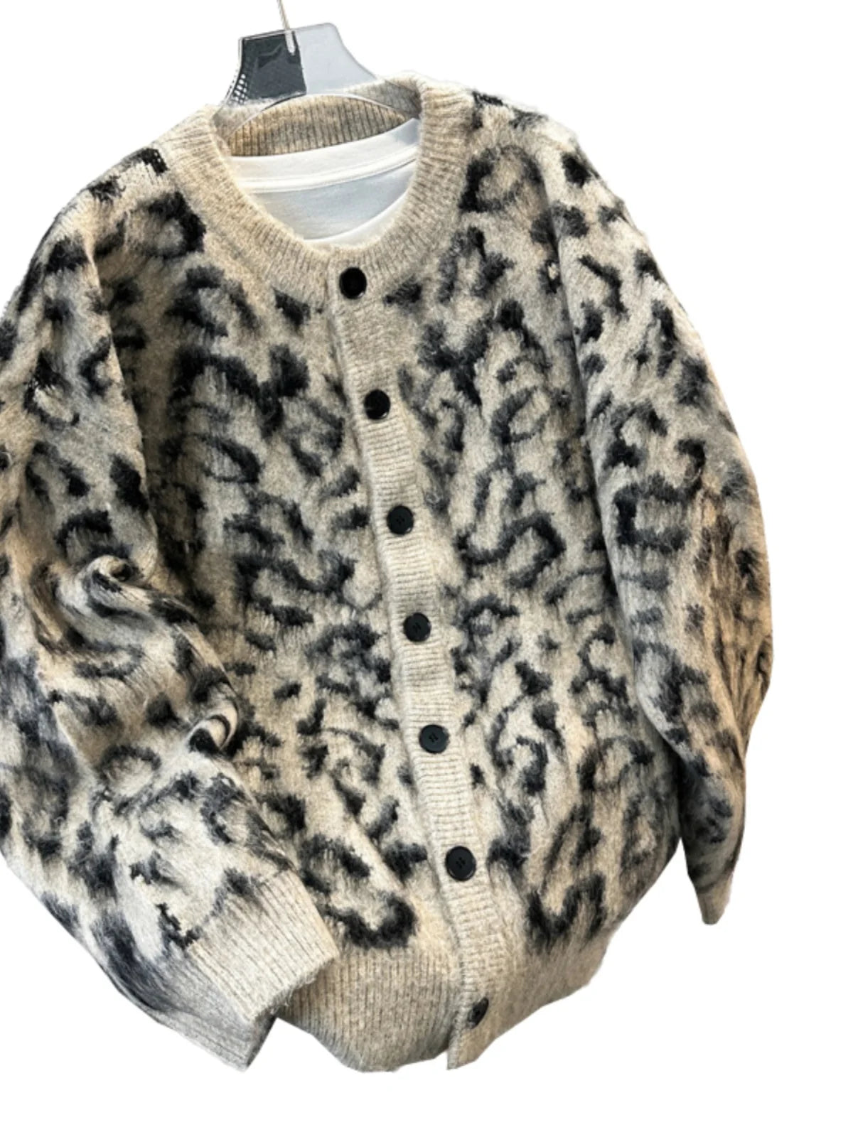 BONSIR - Loose Fit Leopard Print Cardigan Sweater Men's American Sle Knitted Coat Fake Mink Spring Faion Cleanfit Knitwear