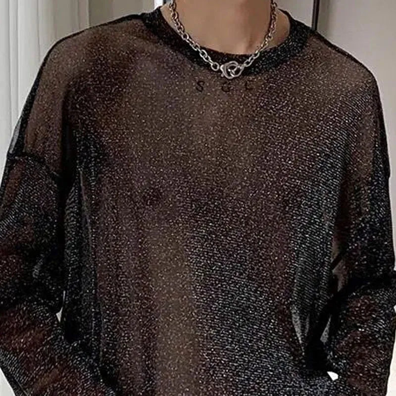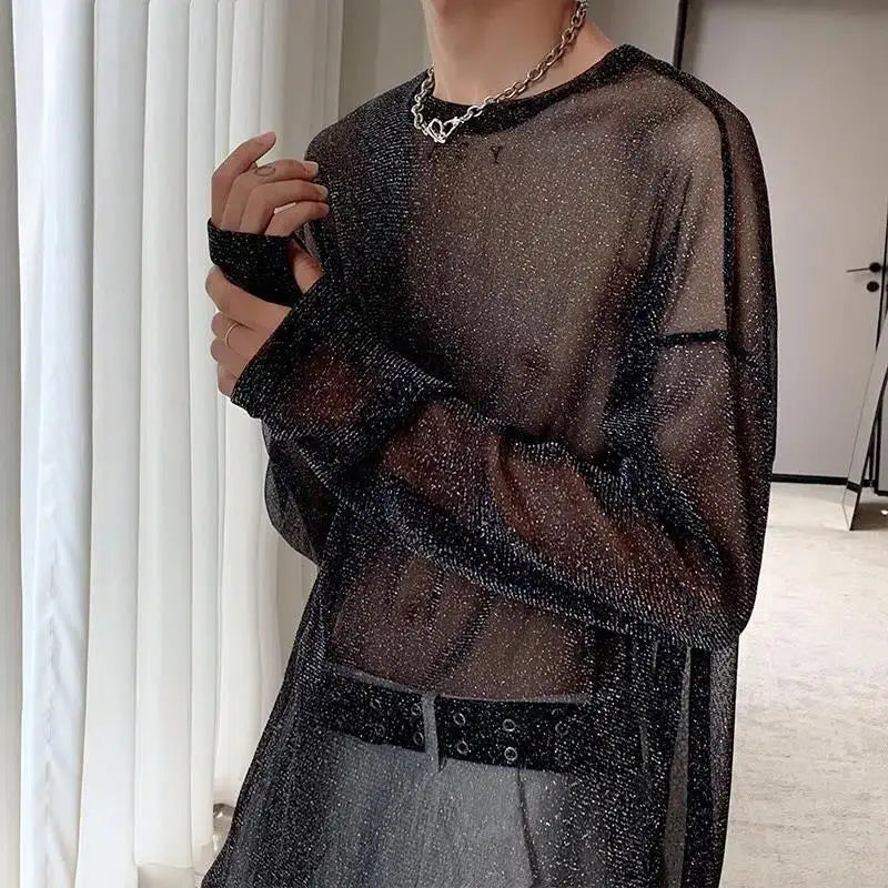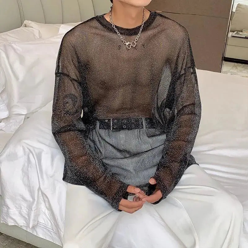 BONSIR  -  Man T-shirt Sheer Mesh Round Neck Long Sleeve Sexy Men's Clothing Tops Out Streetwear Party Thin Style Clothes