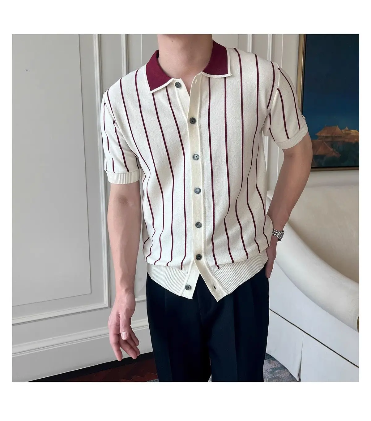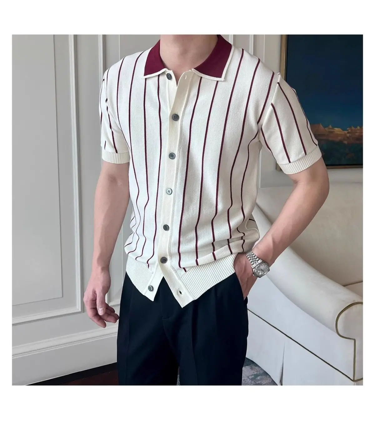 BONSIR - Men's Knitted Stripe Short Sleeve T-Shirt, New Summer Fashion Trendy Brand Youth Versatile Casual Polo Shirt