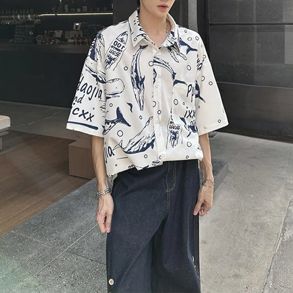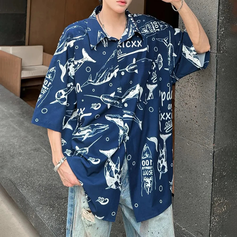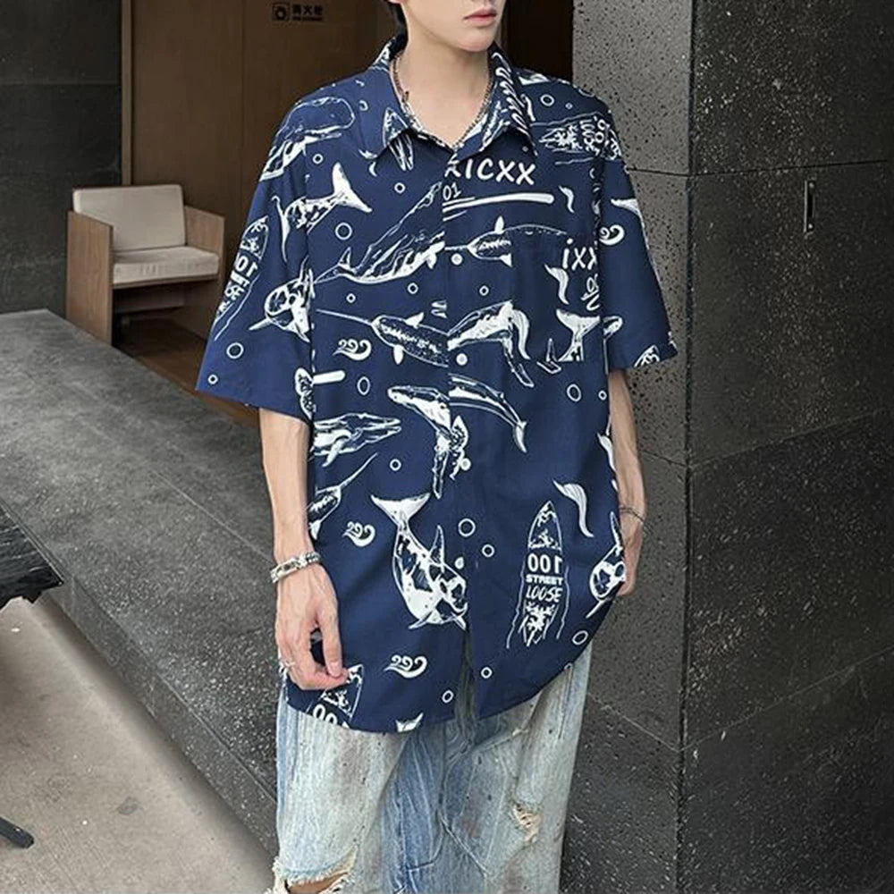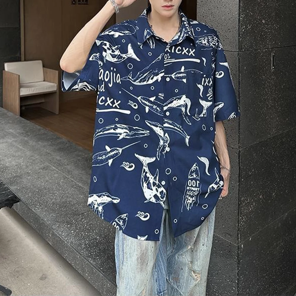 BONSIR - Mens Shirt Whale Ice Silk Casual Shirt Streetwear Fashion Personality Daily Outdoor Loose Short Sleeved Top Men'S Wear 2025 New