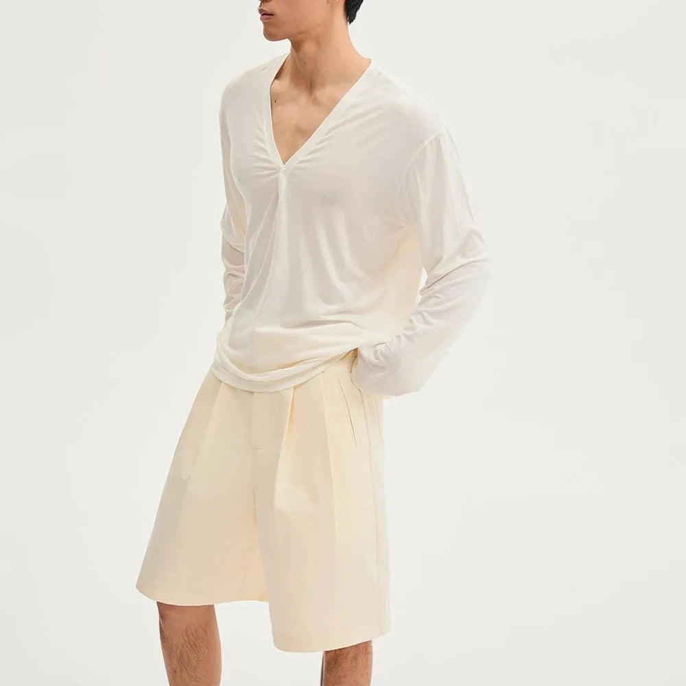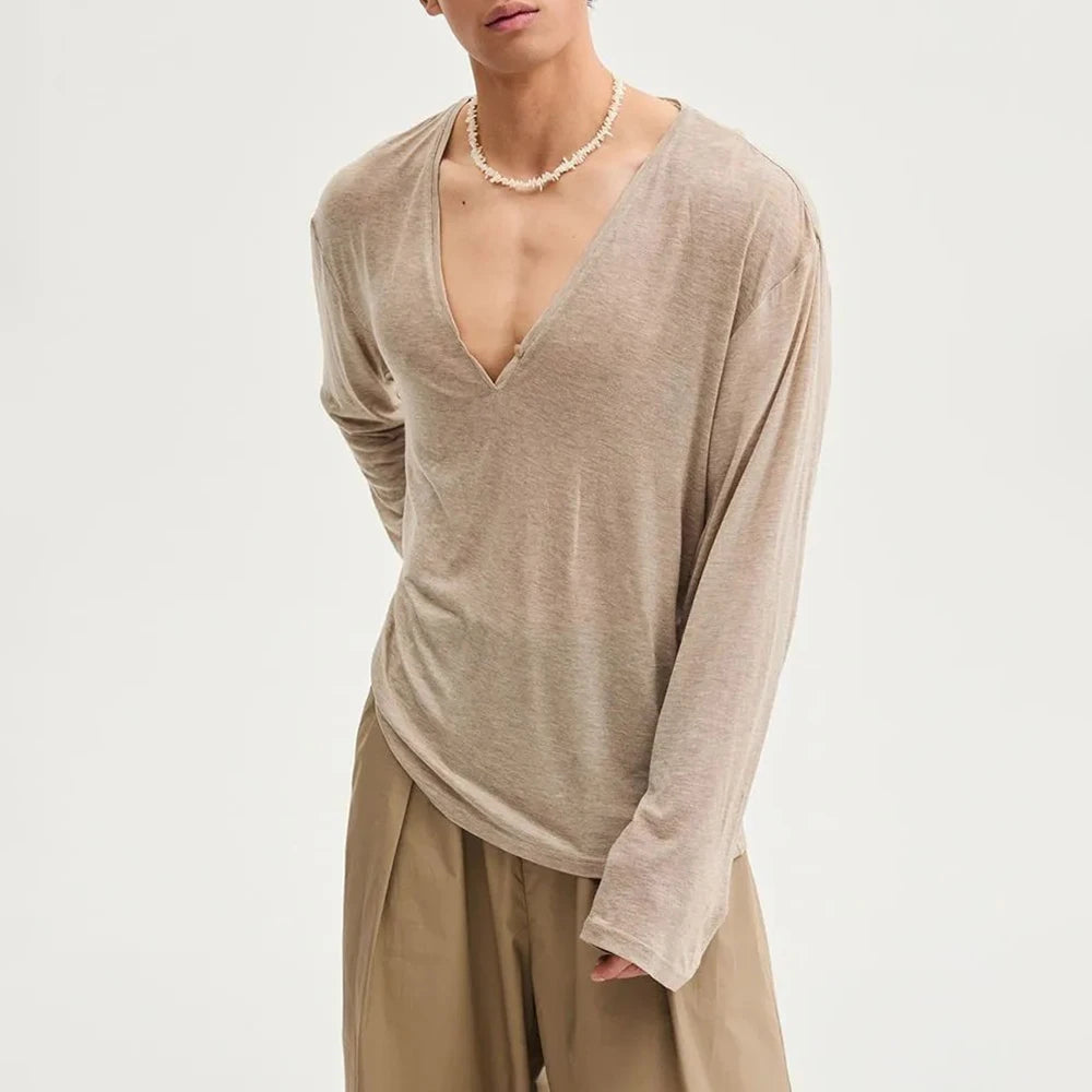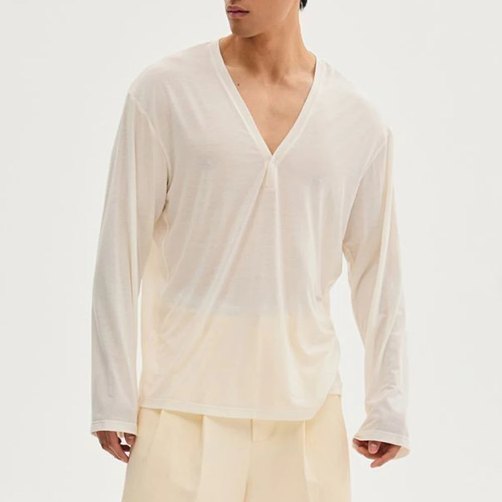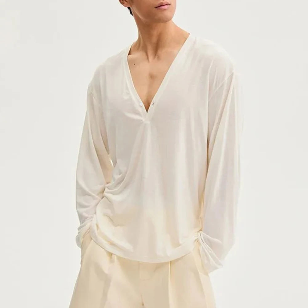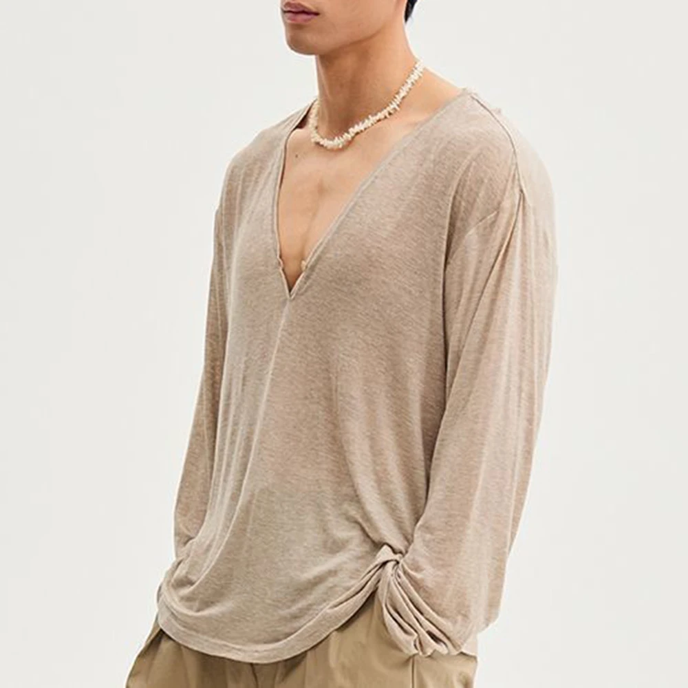 BONSIR - Mens T-Shirt V-Neck Thin Shirt Summer Breathable Daily Plain Simple Comfort Personality Long-Sleeve Top Men'S Clothing 2025 New