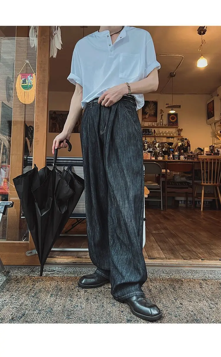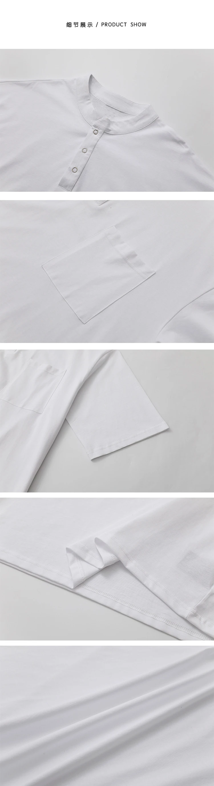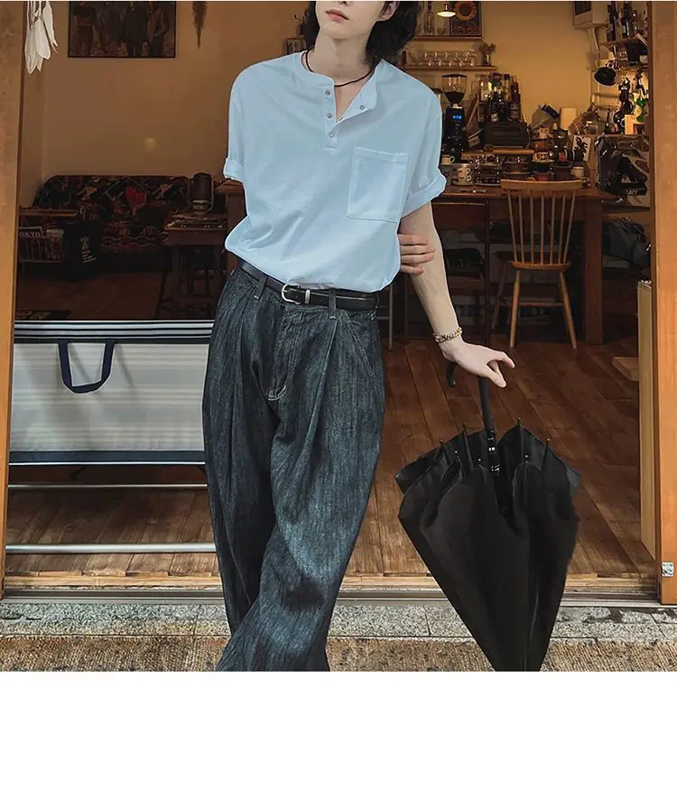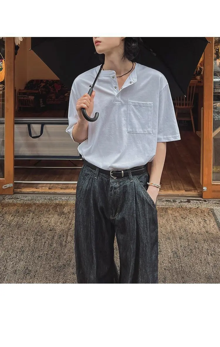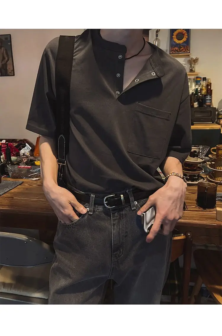 BONSIR - New Fashion Korean Style Men T-shirt Light Luxury Henry Collar Tops Casual Loose High Quality Solid Color Half Sleeve Tees M-2XL