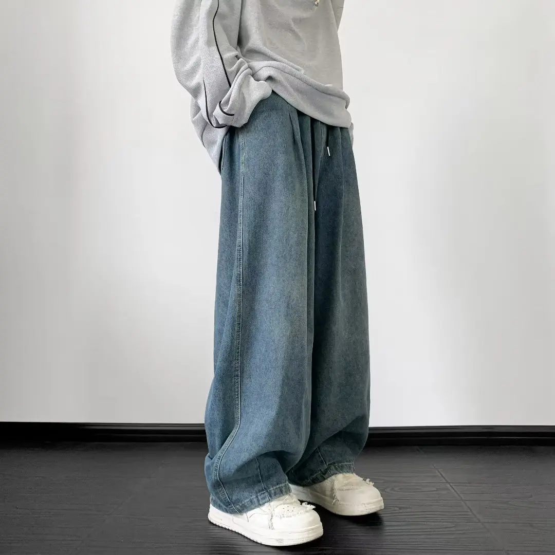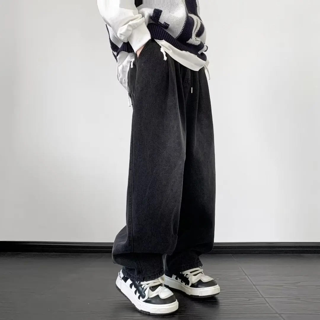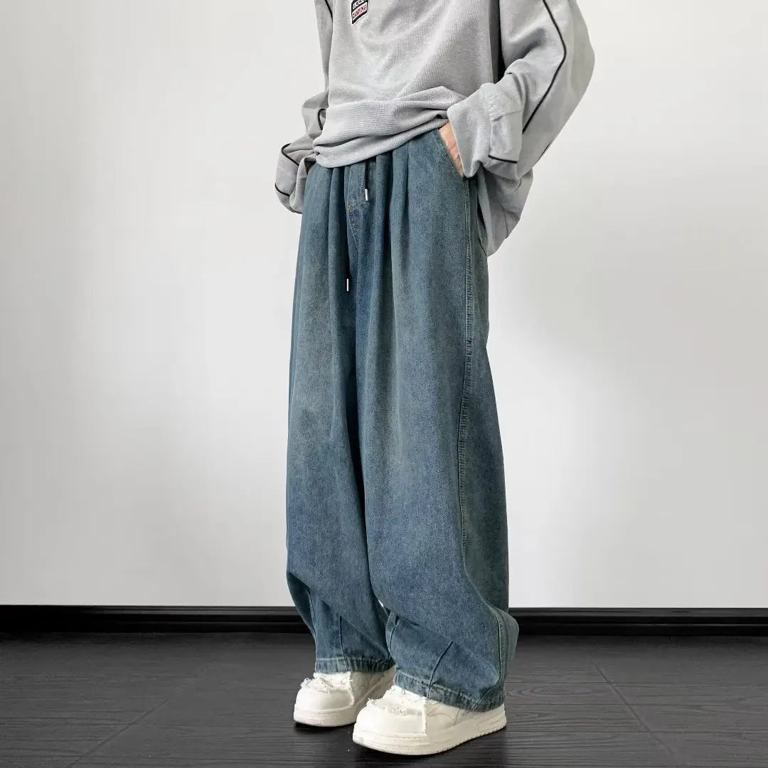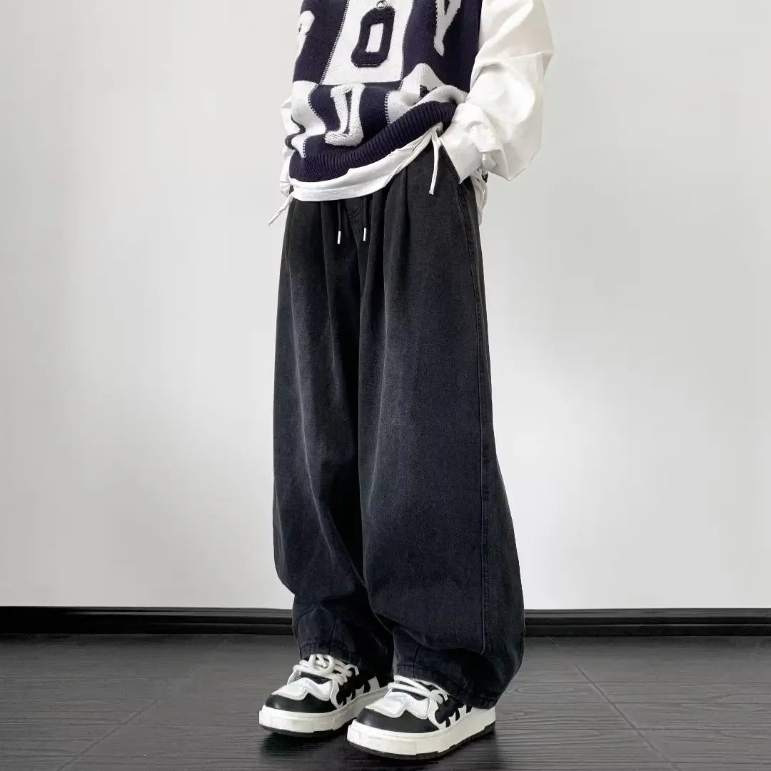 BONSIR - Retro Japanese Sle Dstring Loose Waist Denim Jeans for Men High Street Wide Leg Pants Youthful Trendy Long Trousers