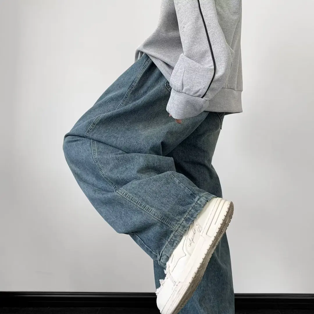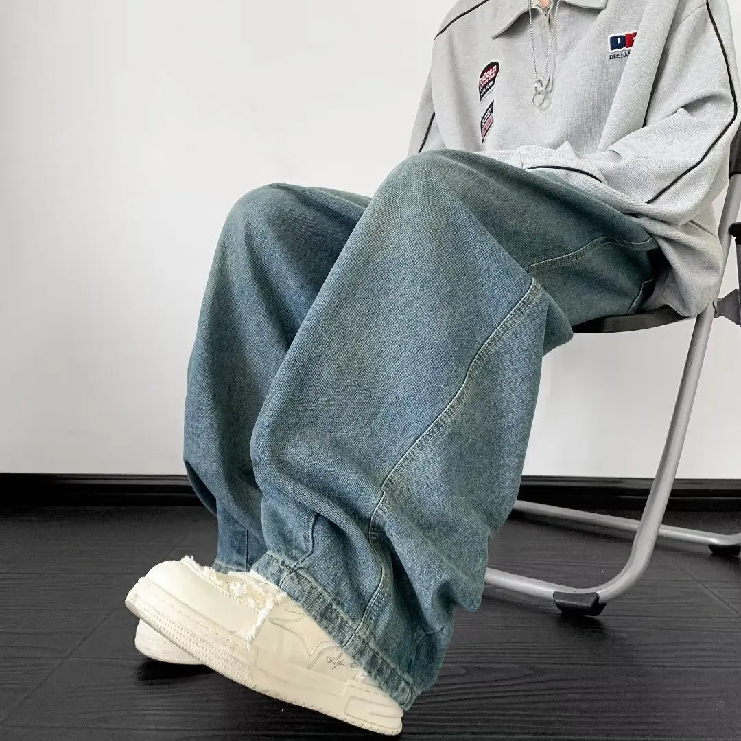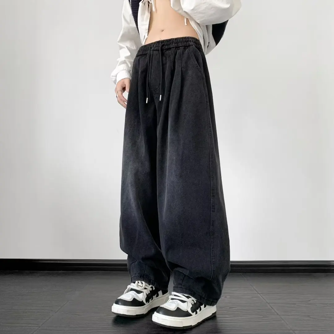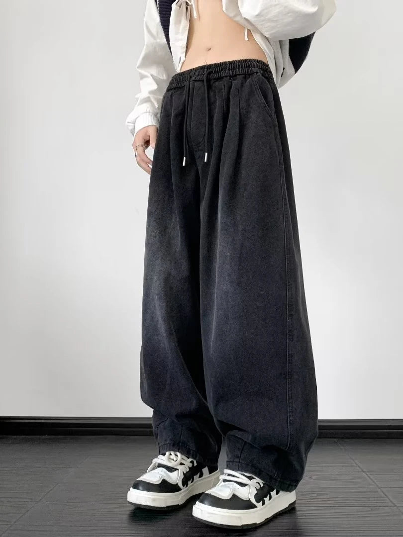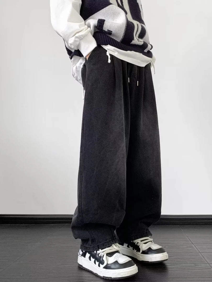 BONSIR - Retro Japanese Sle Dstring Loose Waist Denim Jeans for Men High Street Wide Leg Pants Youthful Trendy Long Trousers