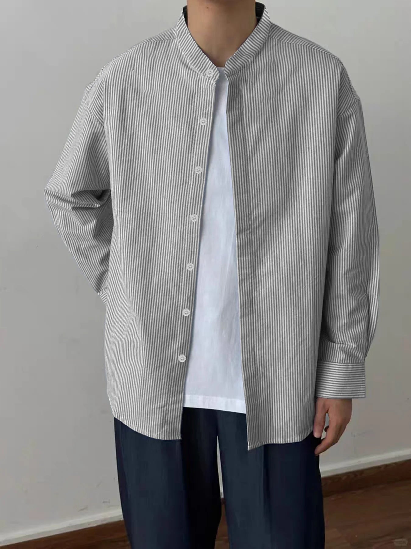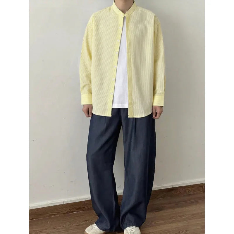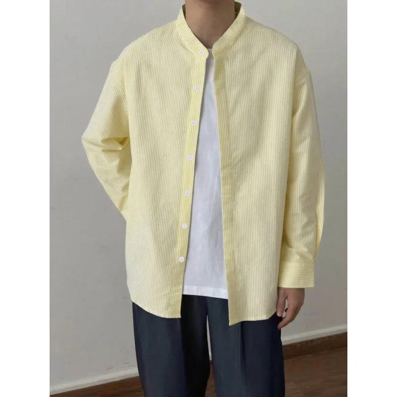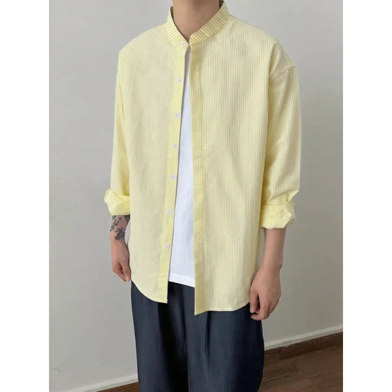 BONSIR - Spring and Autumn New Chinese Stand Up Collar Shirt Men's Handsome Comfortable Textured Long-Sleeved Striped Shirt