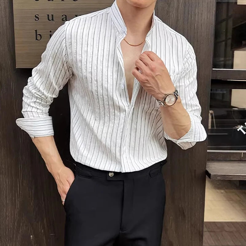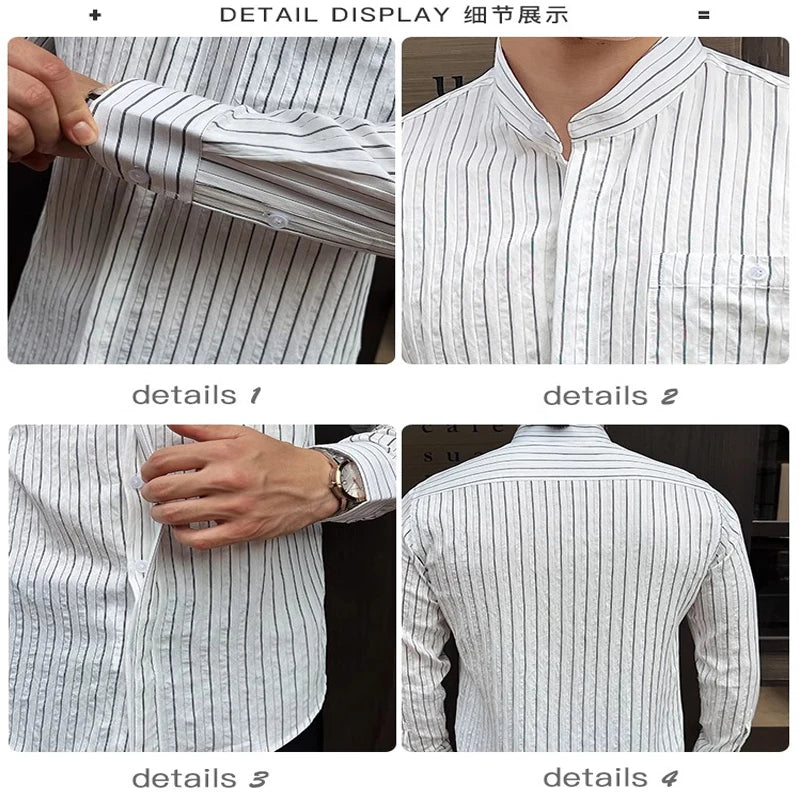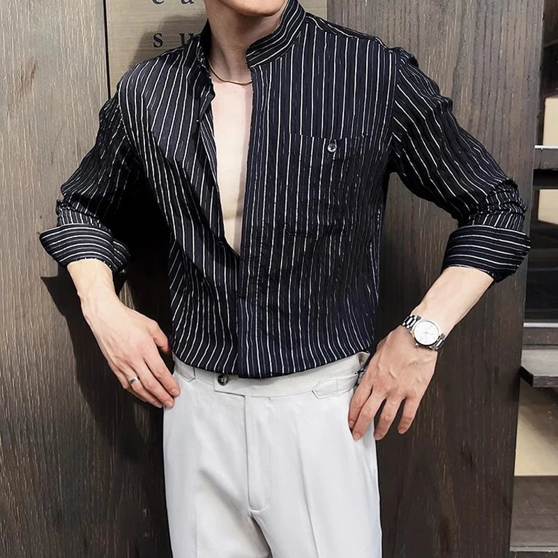 BONSIR - Spring Autumn Stretchable Men Shitrs Stand Collar Single-breasted Long Sleeve Men's Striped Shirt Fashion Handsome Streetwear