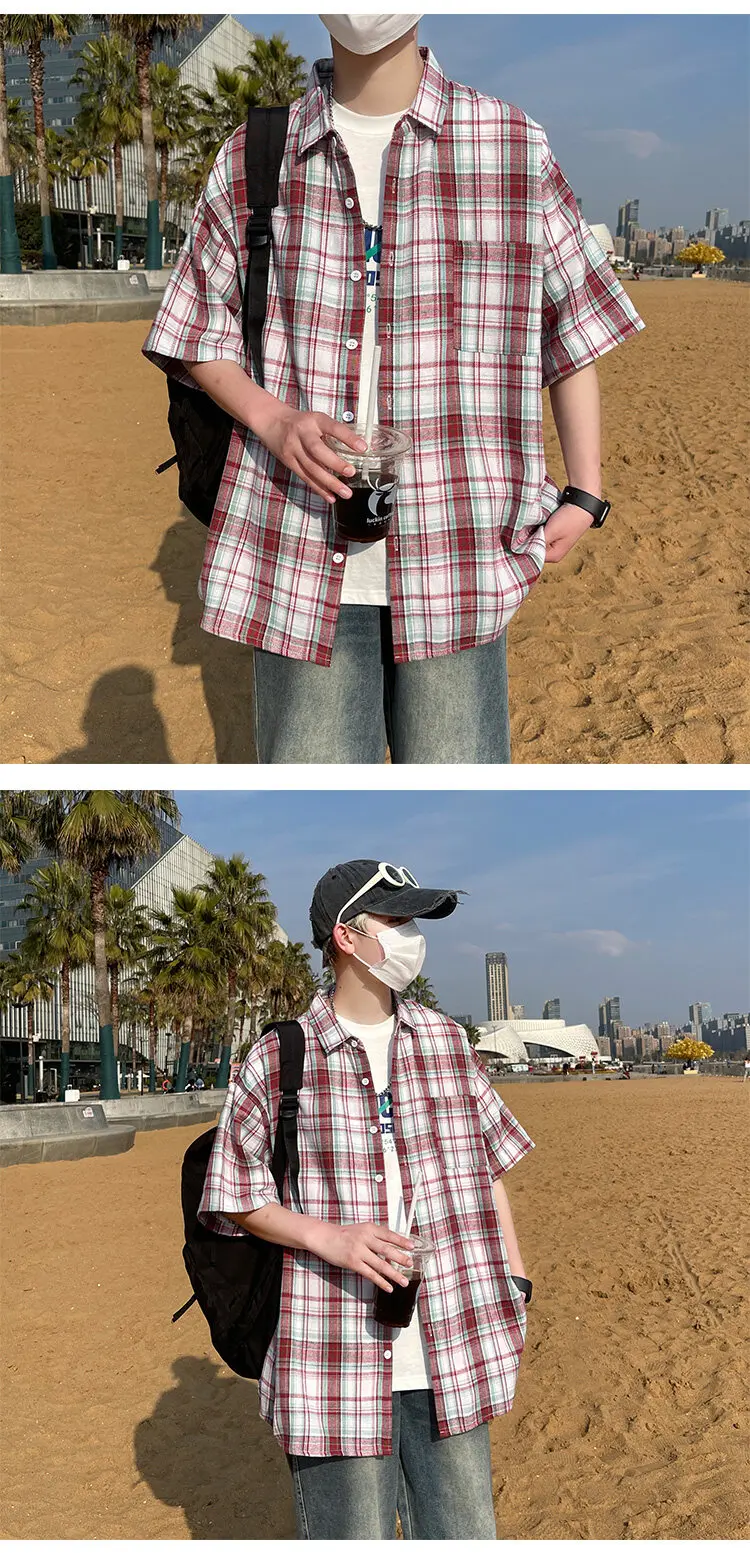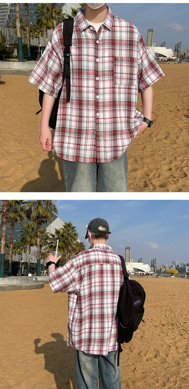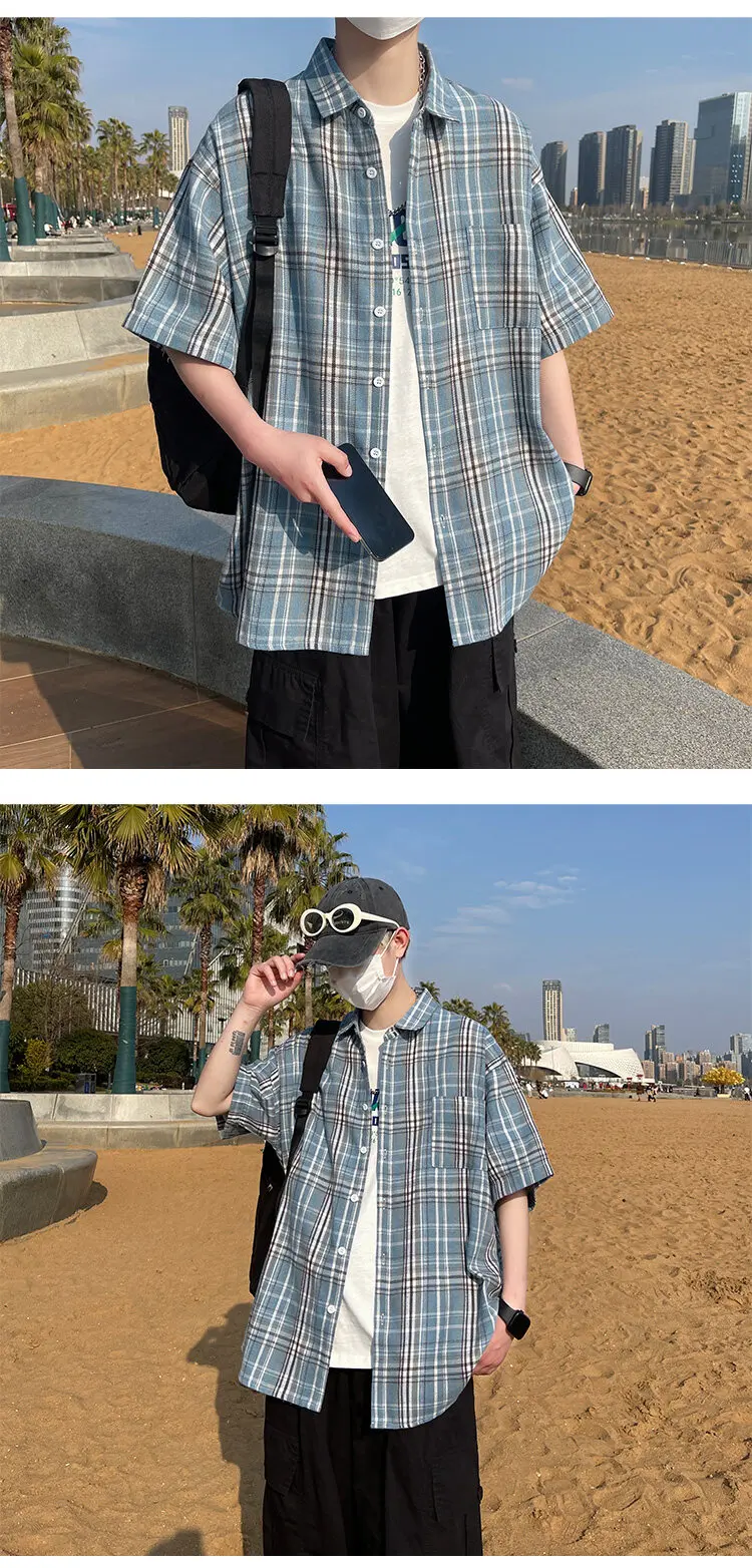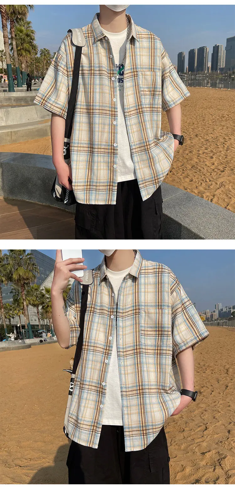 BONSIR - Summer Large Size Men Oversized Shirts Fashion Hip Hop Short Sleeved Loose Man Shirt Plaid Print Single Pocket Casual Mens Shirt