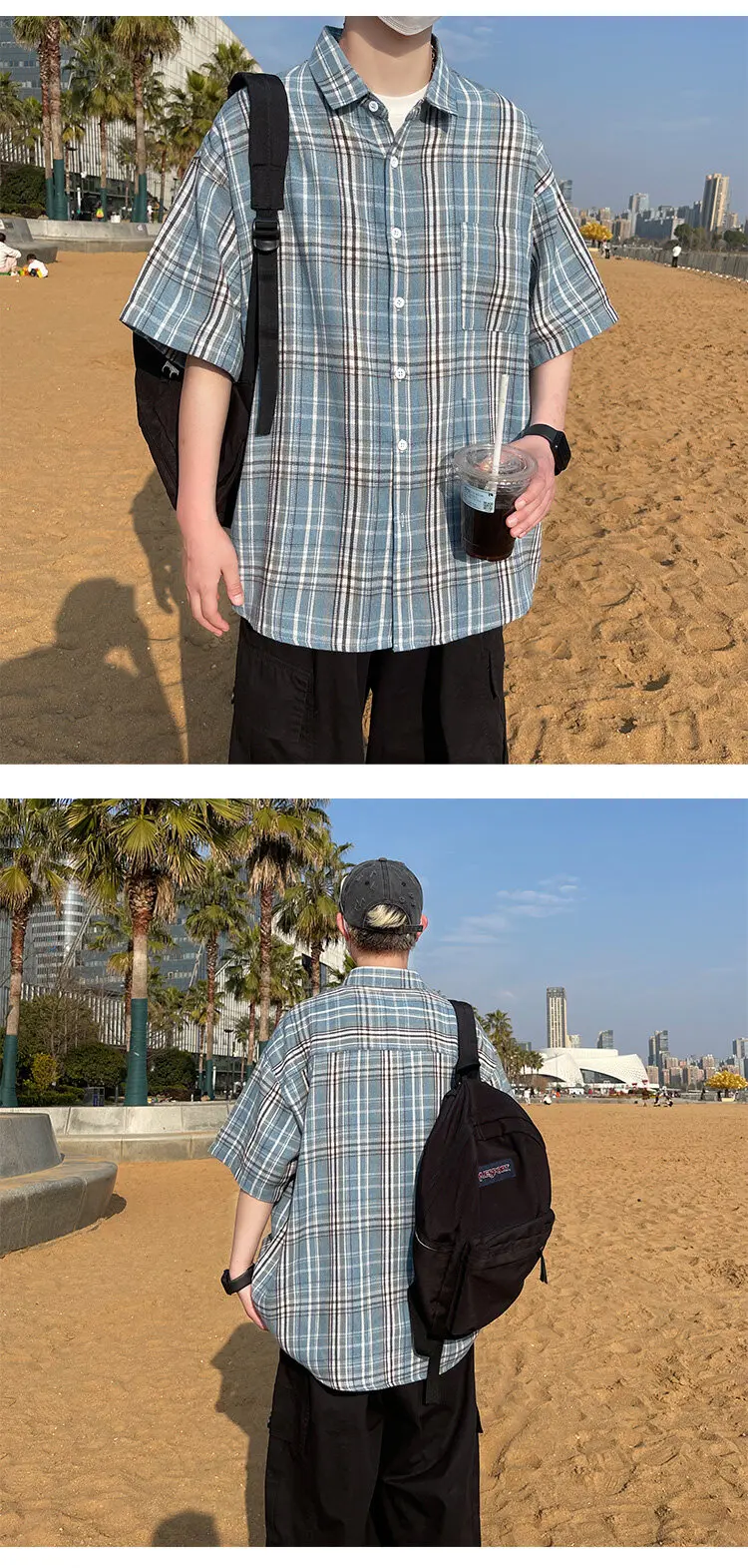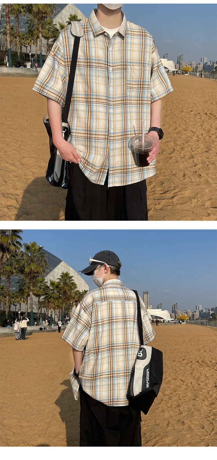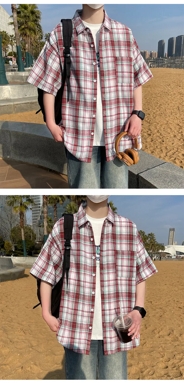 BONSIR - Summer Large Size Men Oversized Shirts Fashion Hip Hop Short Sleeved Loose Man Shirt Plaid Print Single Pocket Casual Mens Shirt