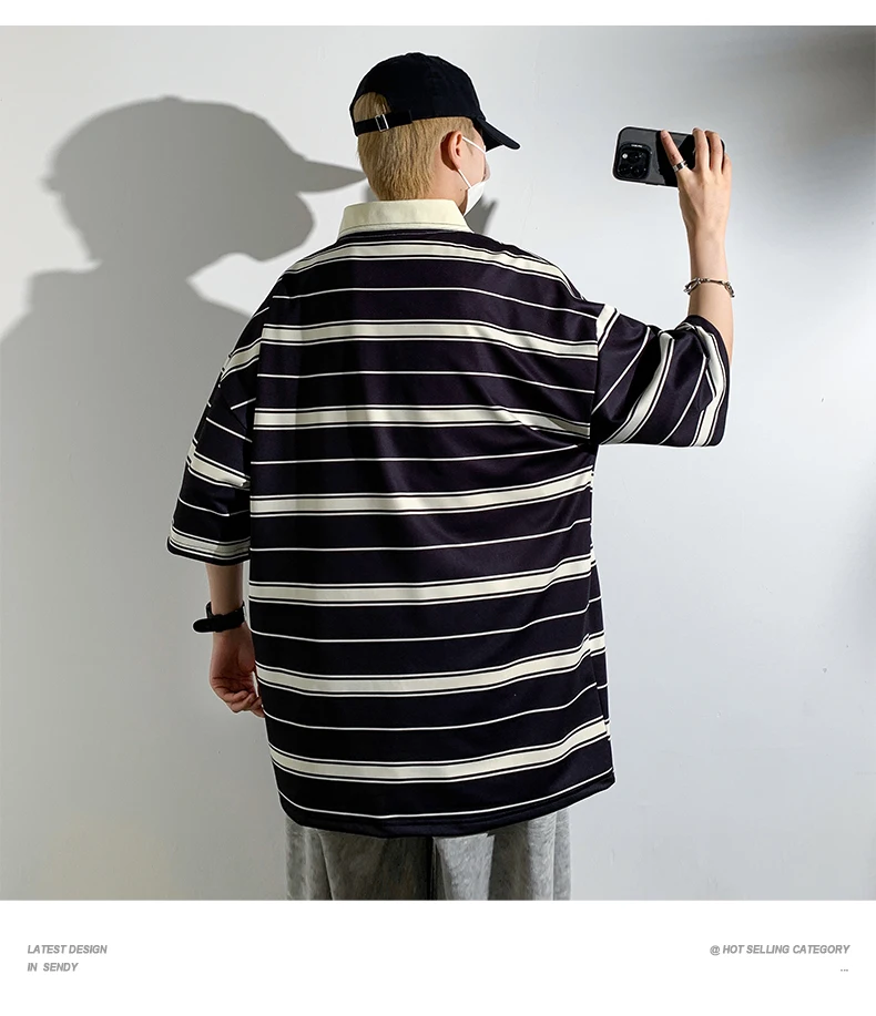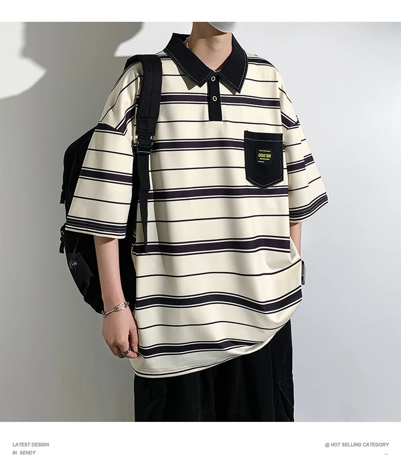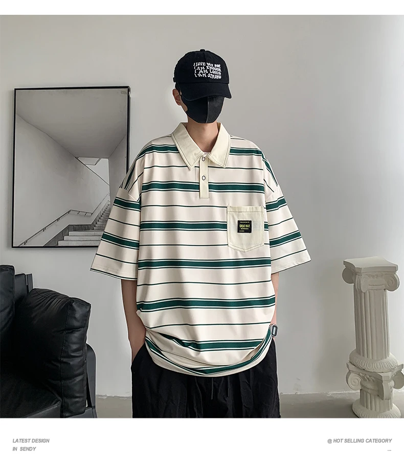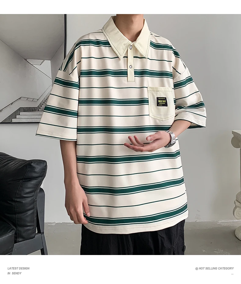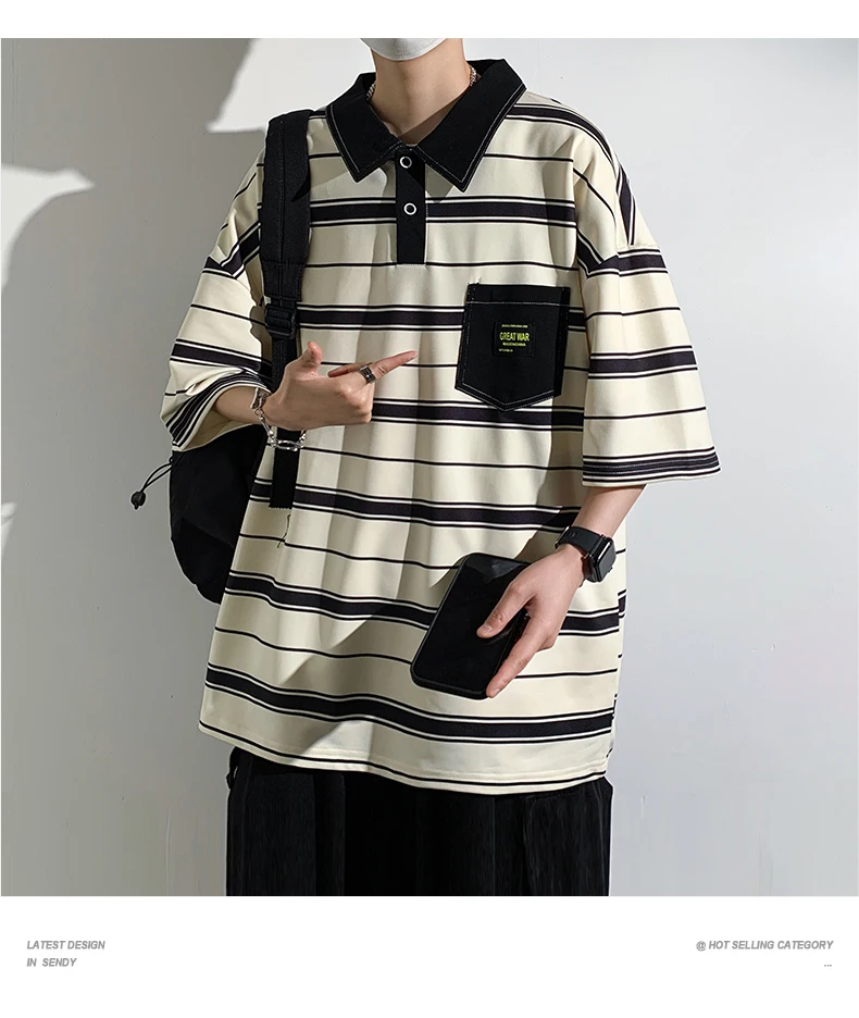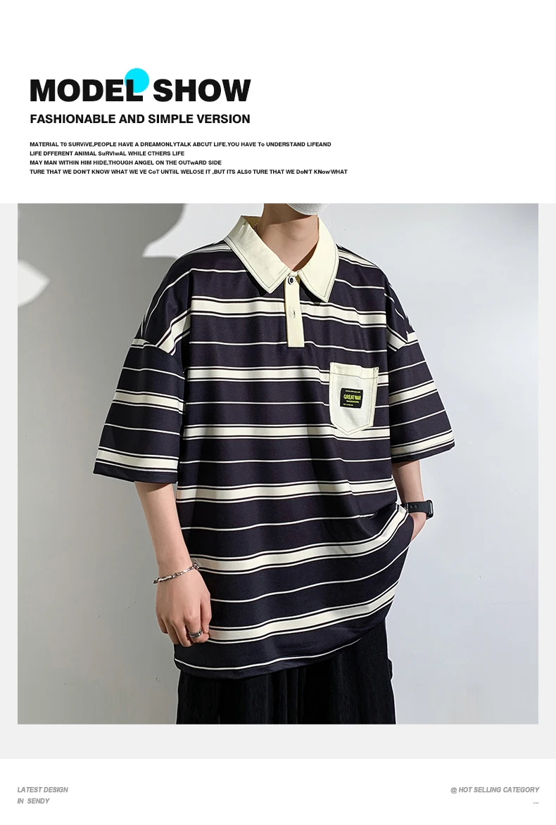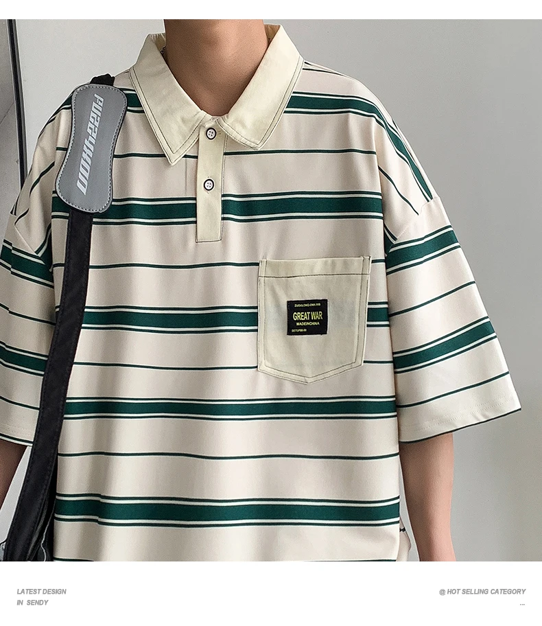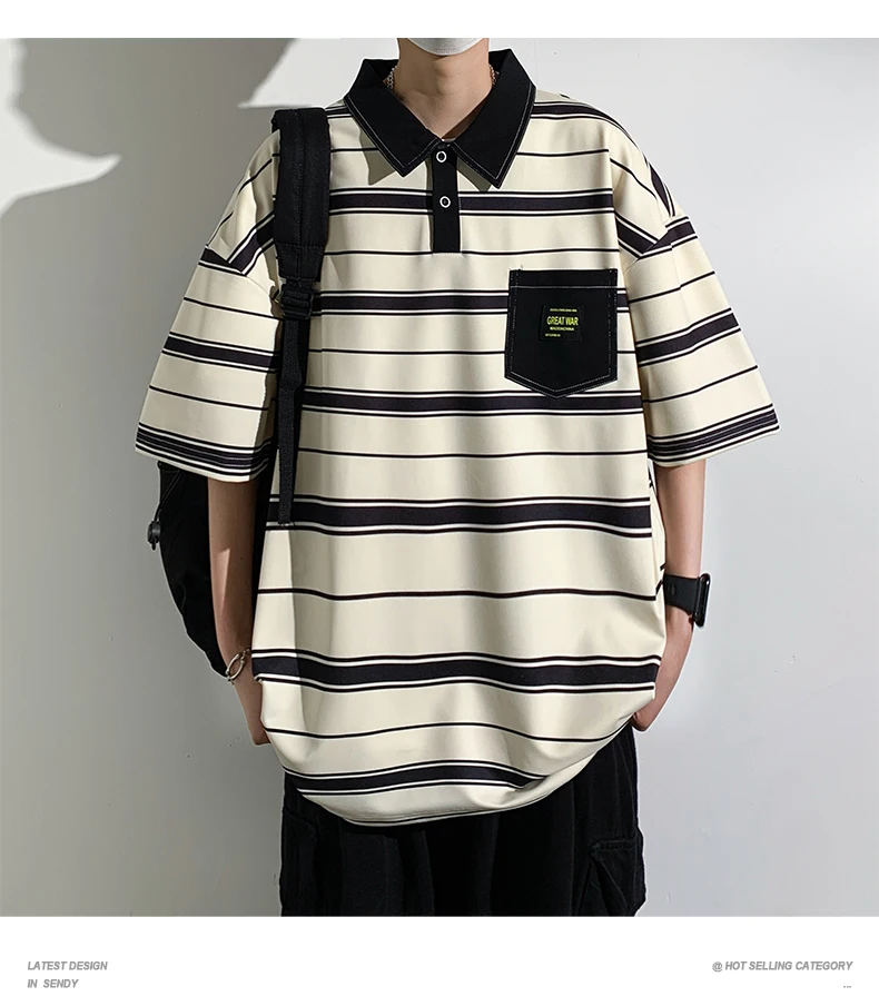 BONSIR - Summer Men's New Fashion Polo shirts Hong Kong Style Youthful Vitality Lapel Striped Button Pockets Half Sleeve Casual Tops