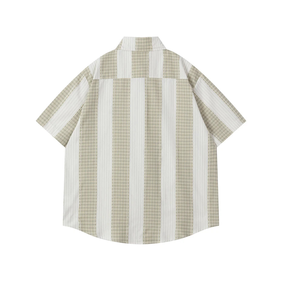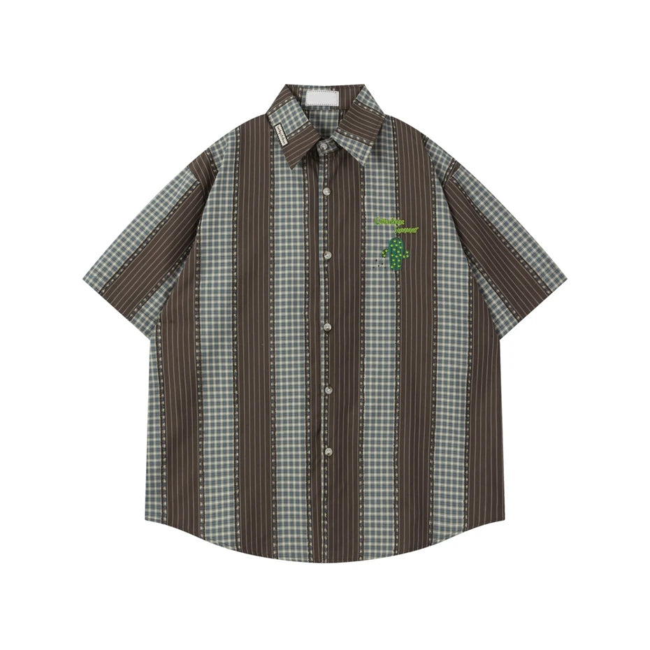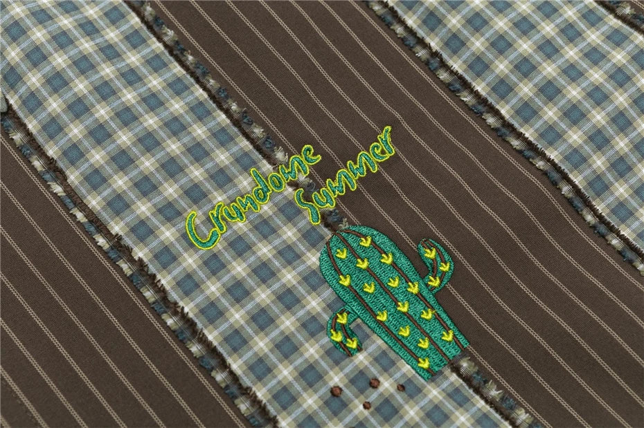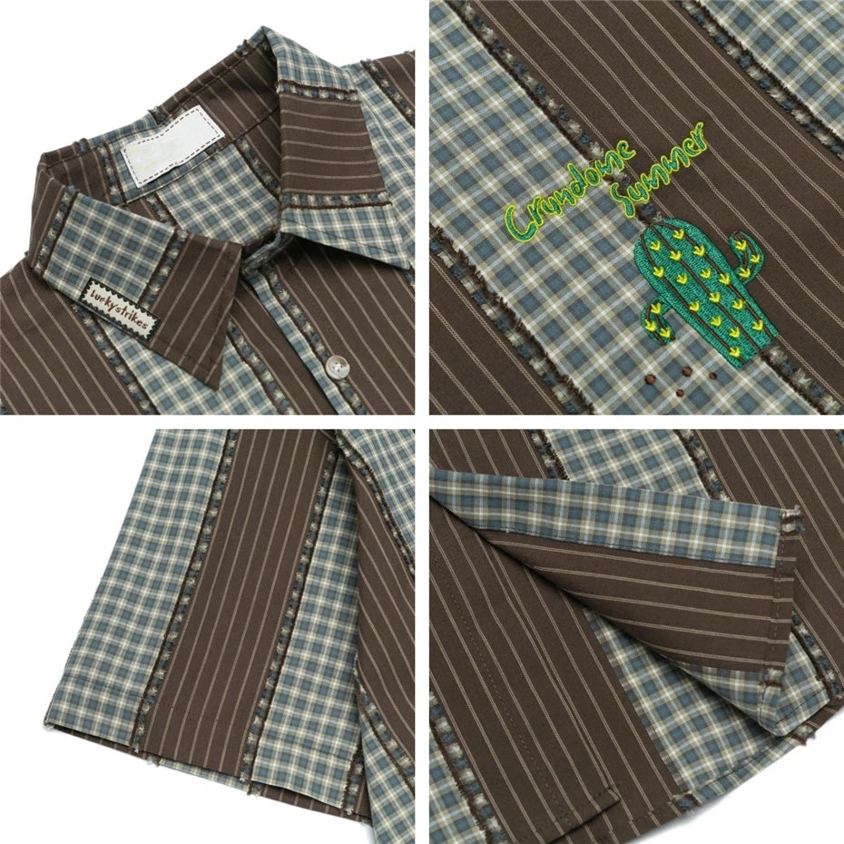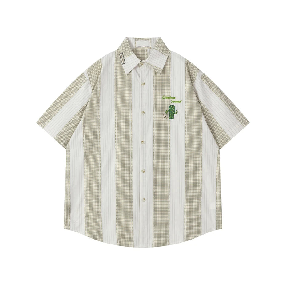 BONSIR - Summer Mens Striped Shirts Hip Hop Patchwork Cactus Embroidery Blouses 2025 Harajuku Streetwear Casual Fashion Loose Shirts