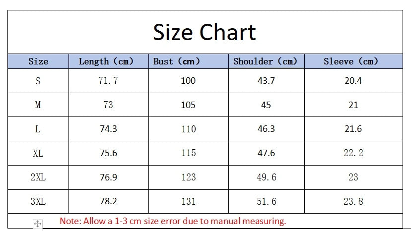 Note: Allow a 1-3 cm size error due to manual measuring.