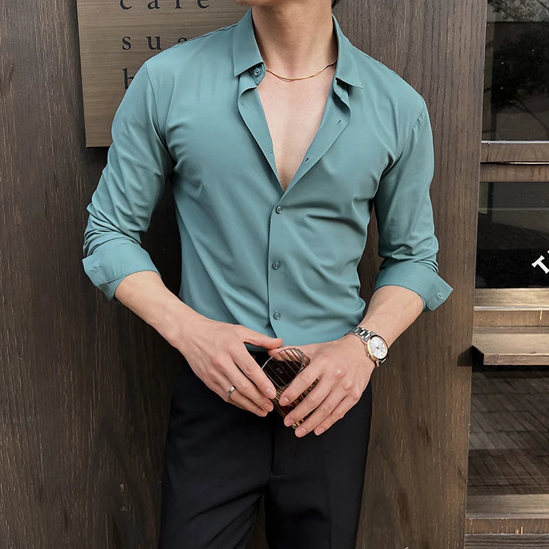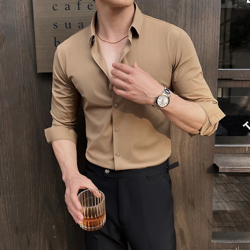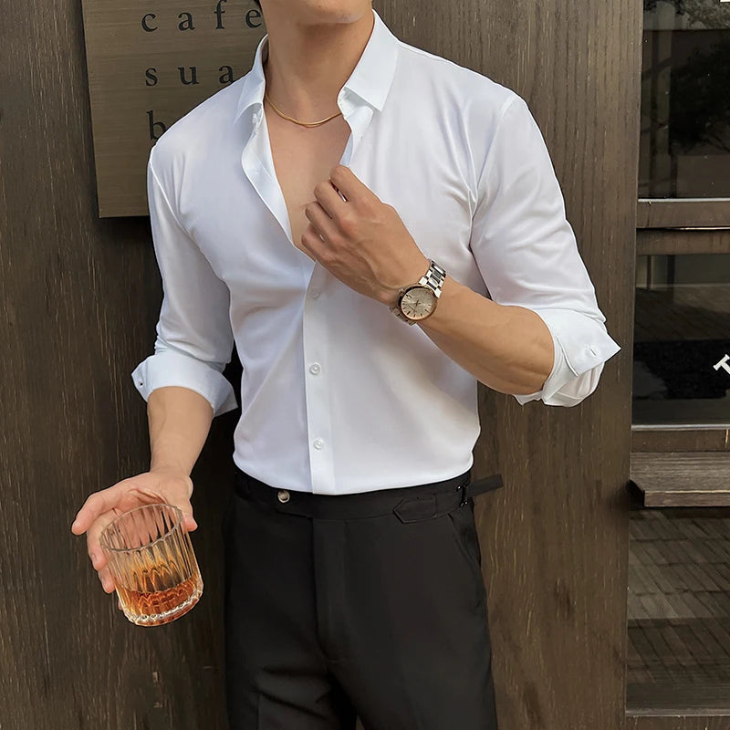 BONSIR - High Elasticity Long Sleeve Men's Dress Shirts Business Gentleman Social Slim-fit Men Shirt Casual Button Up Solid Mens Clothing