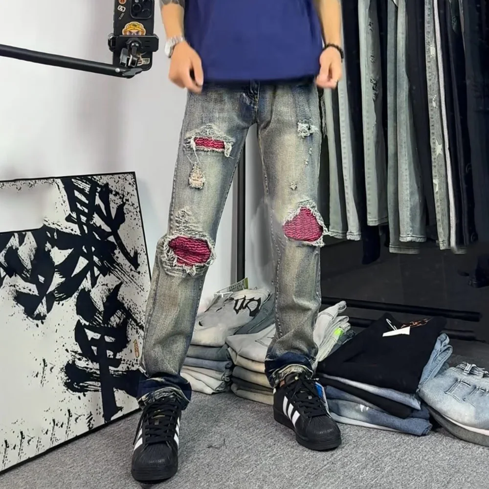 BONSIR - Summer New Men's Ripped Contrast Color Denim Pants Y2k Harajuku American Trend Retro Fashion Hip-hop Niche Loose Men Bottom
