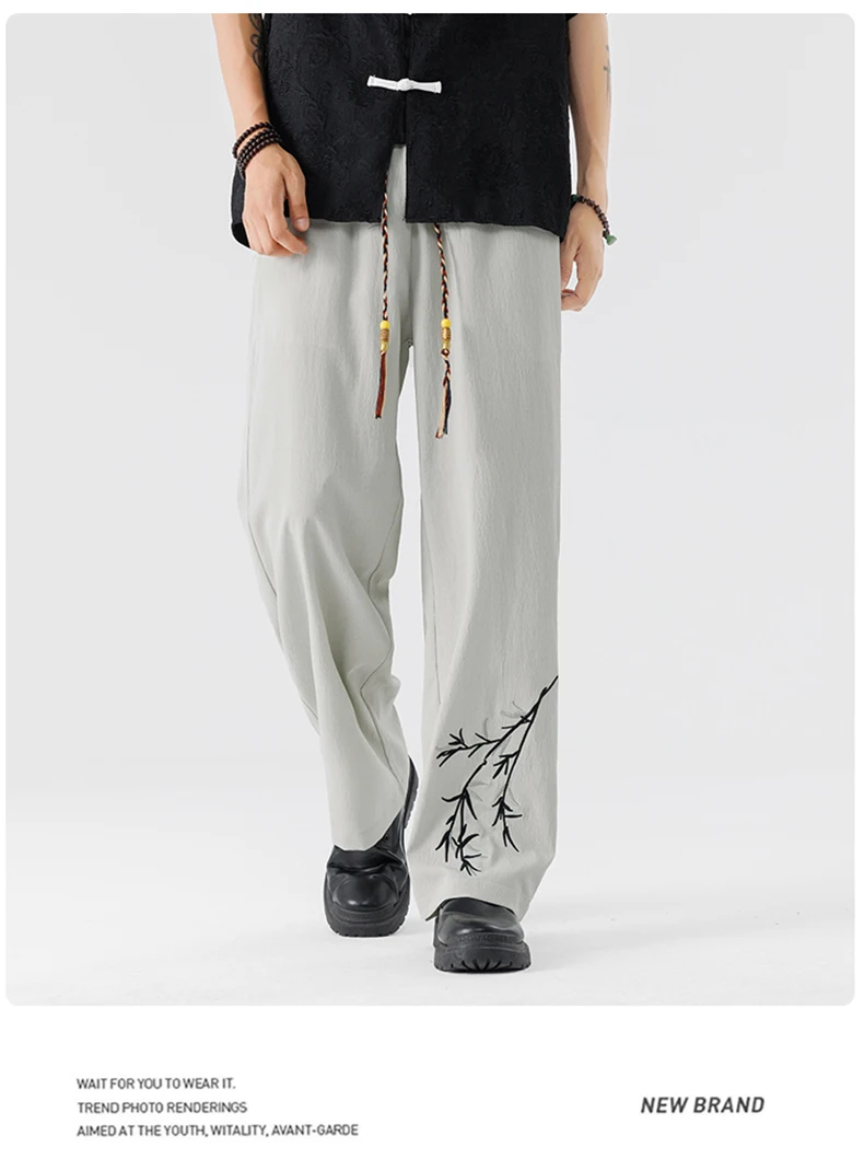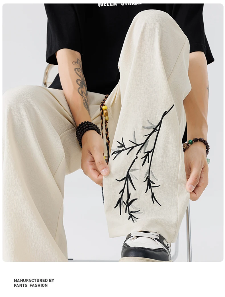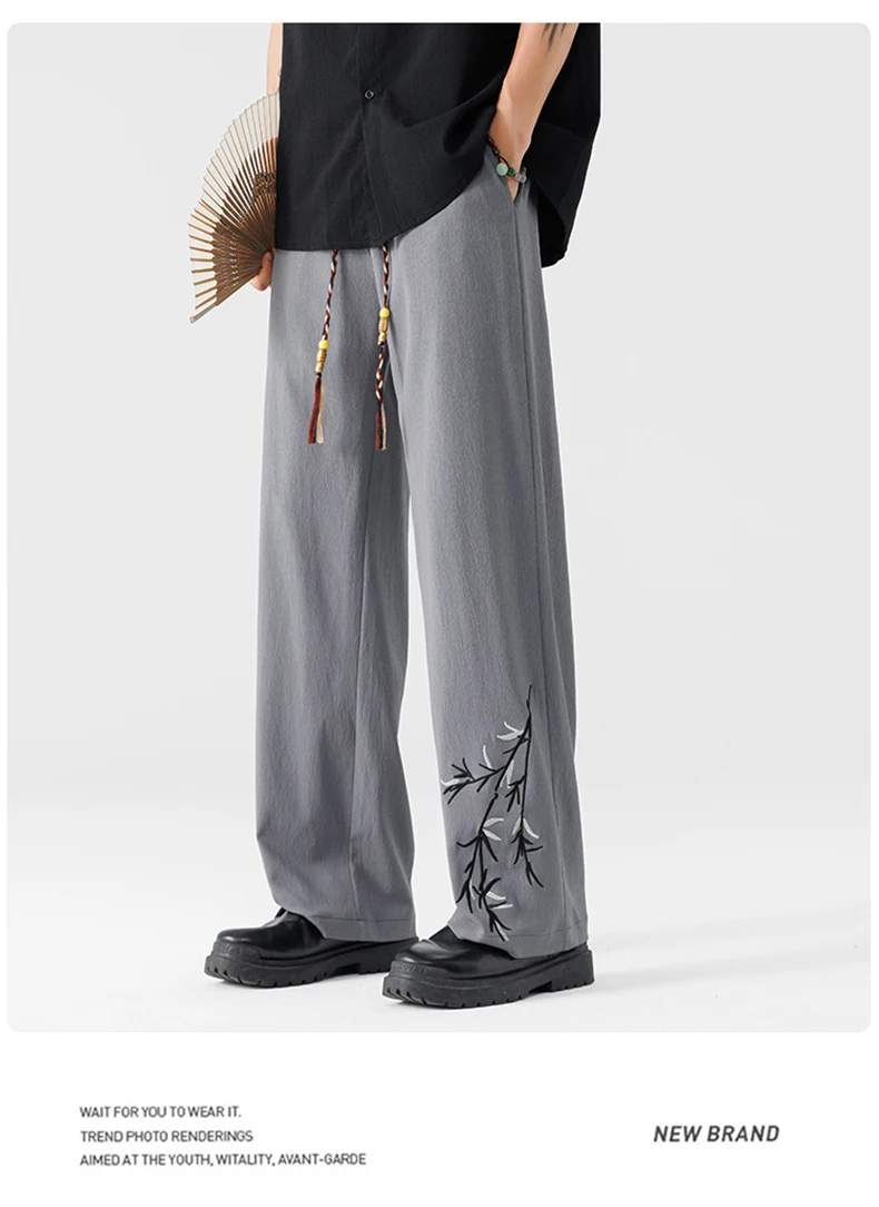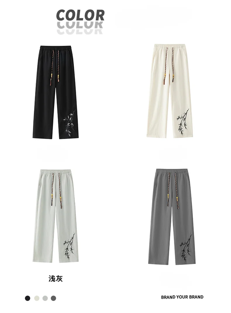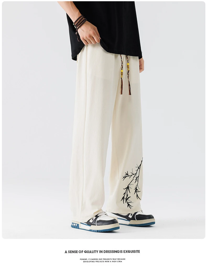 BONSIR - Drawstring Sweatpants Thin Men's Fashion Embroidered Wide Pants Straight Comfortable Casual Male Clothes Trousers Streetwear