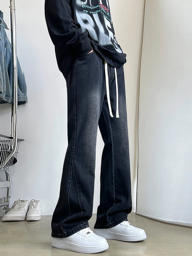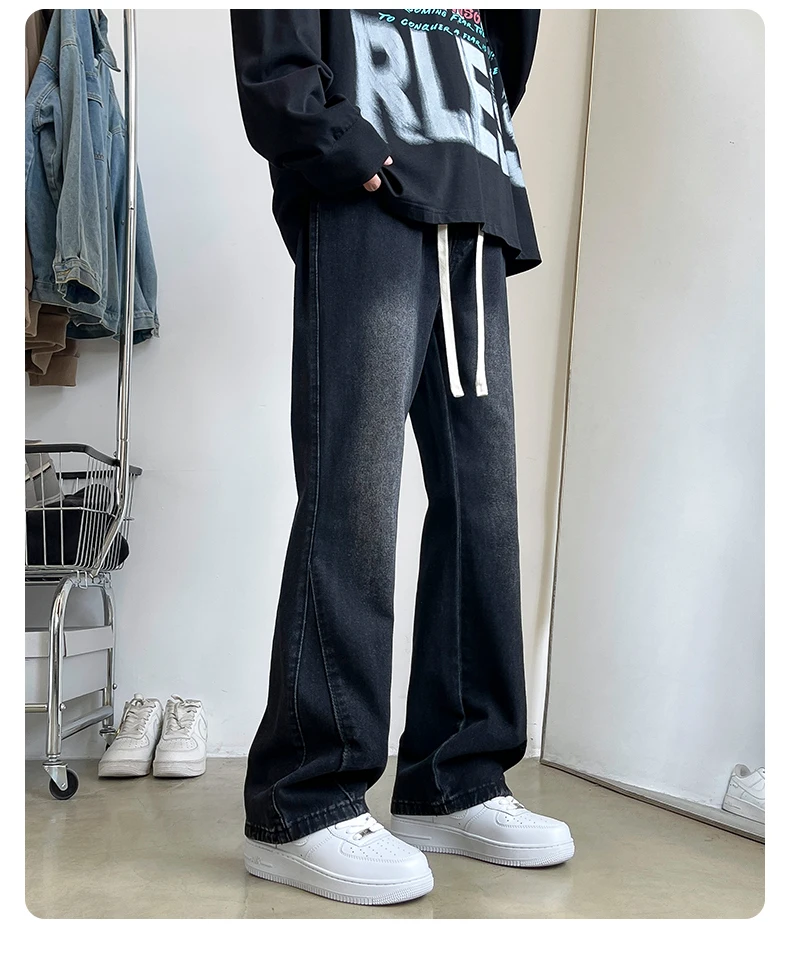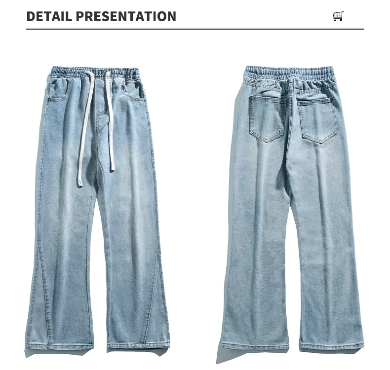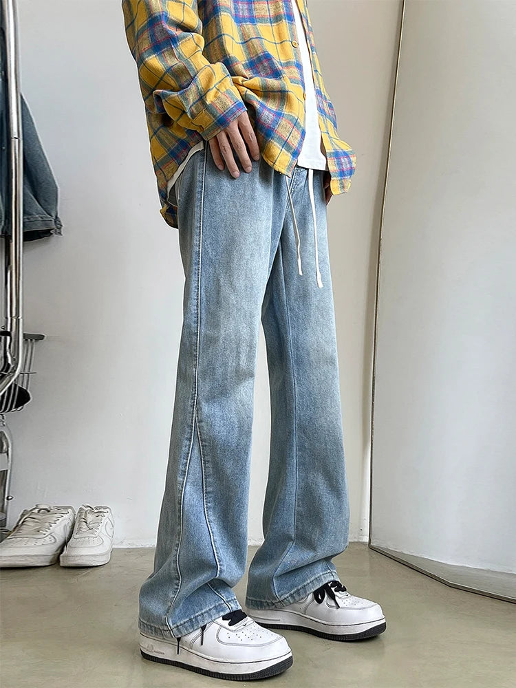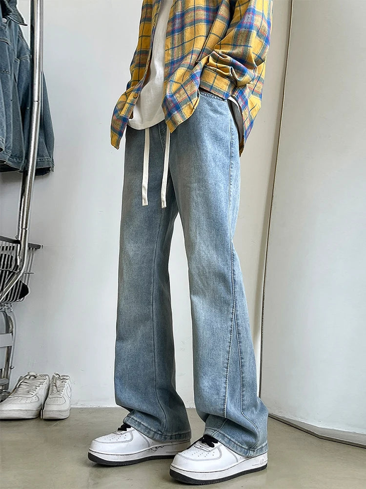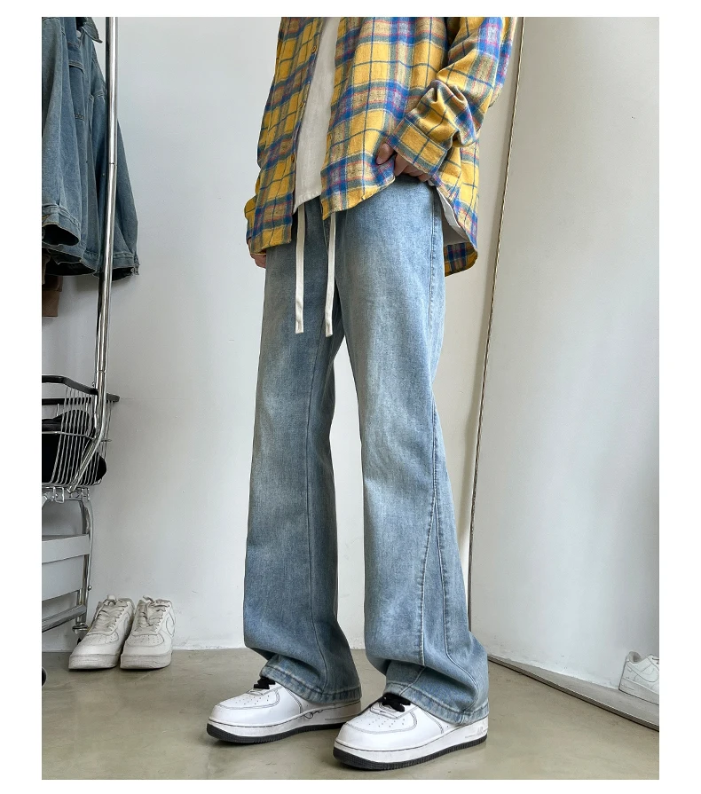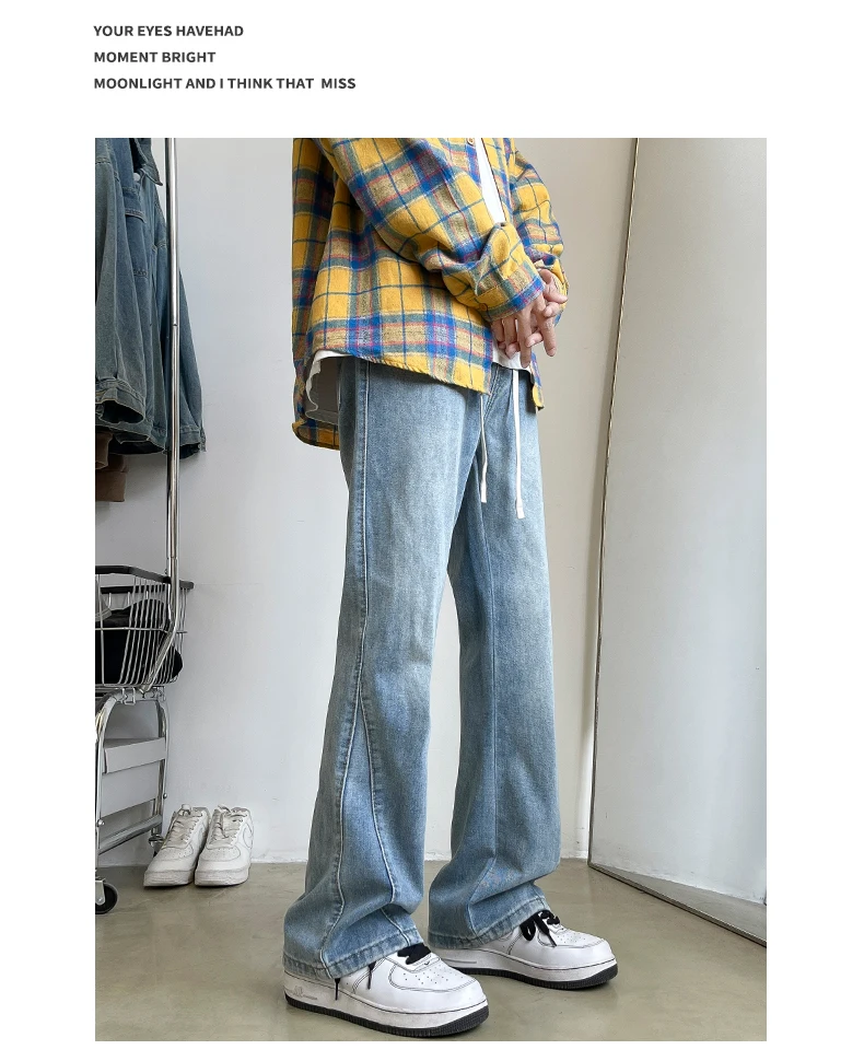 BONSIR - Fashion Patchwork Men's Bootcut Jeans Elastic Waist Drawstring Denim Pants High Street Classic Light Blue Black Male Trousers