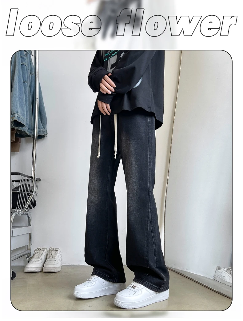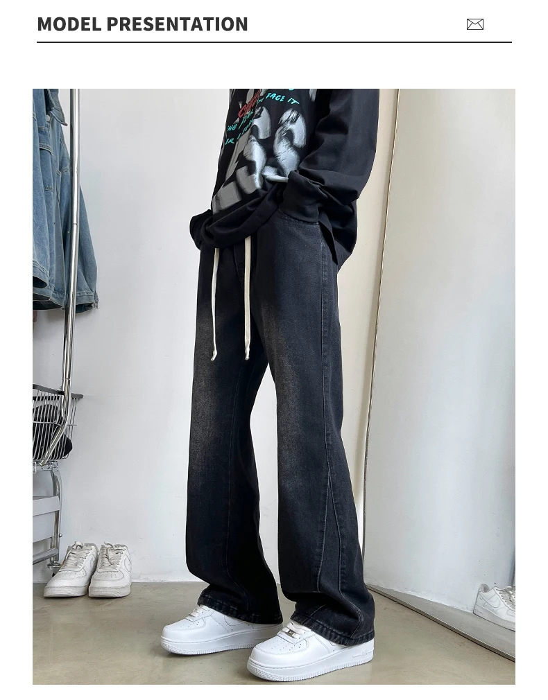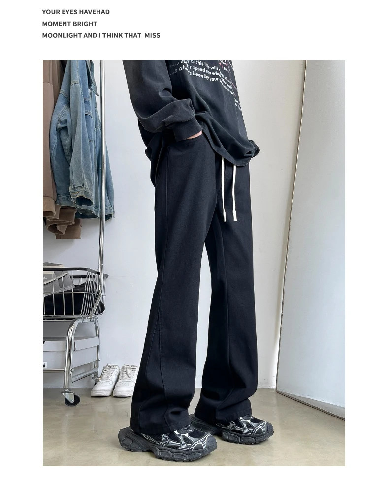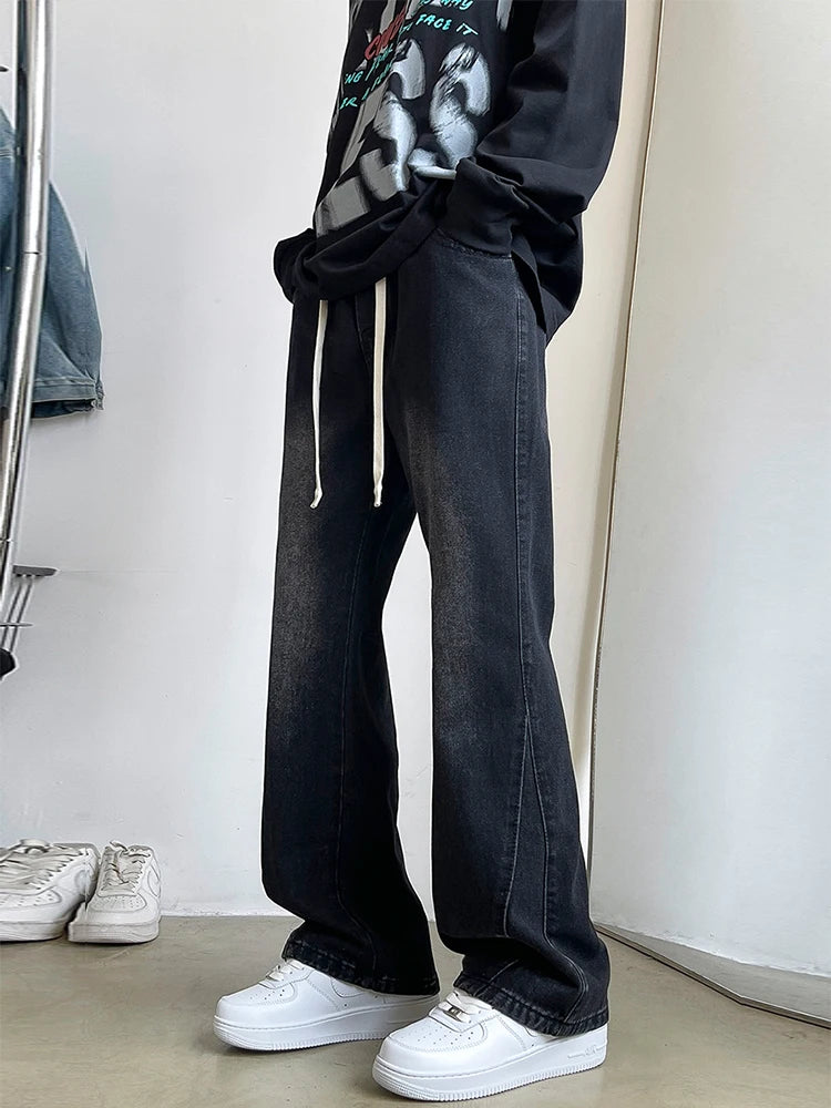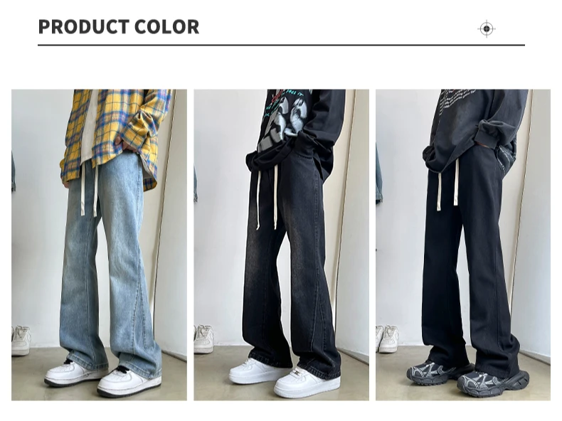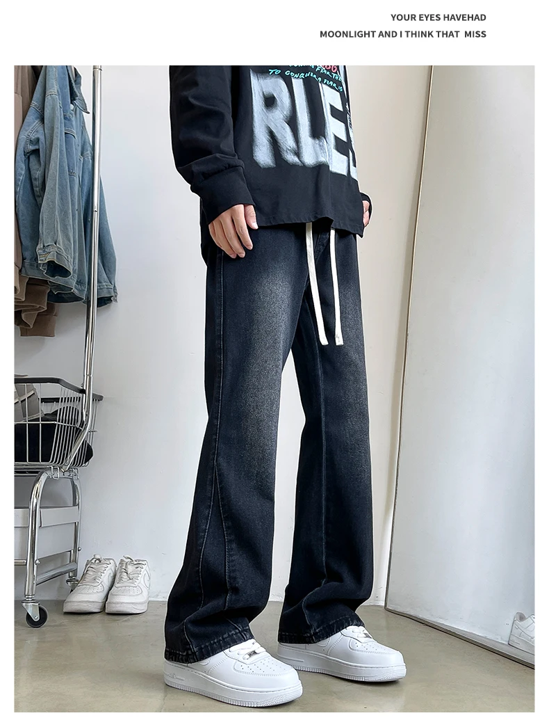 BONSIR - Fashion Patchwork Men's Bootcut Jeans Elastic Waist Drawstring Denim Pants High Street Classic Light Blue Black Male Trousers