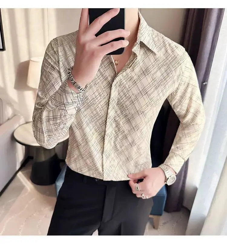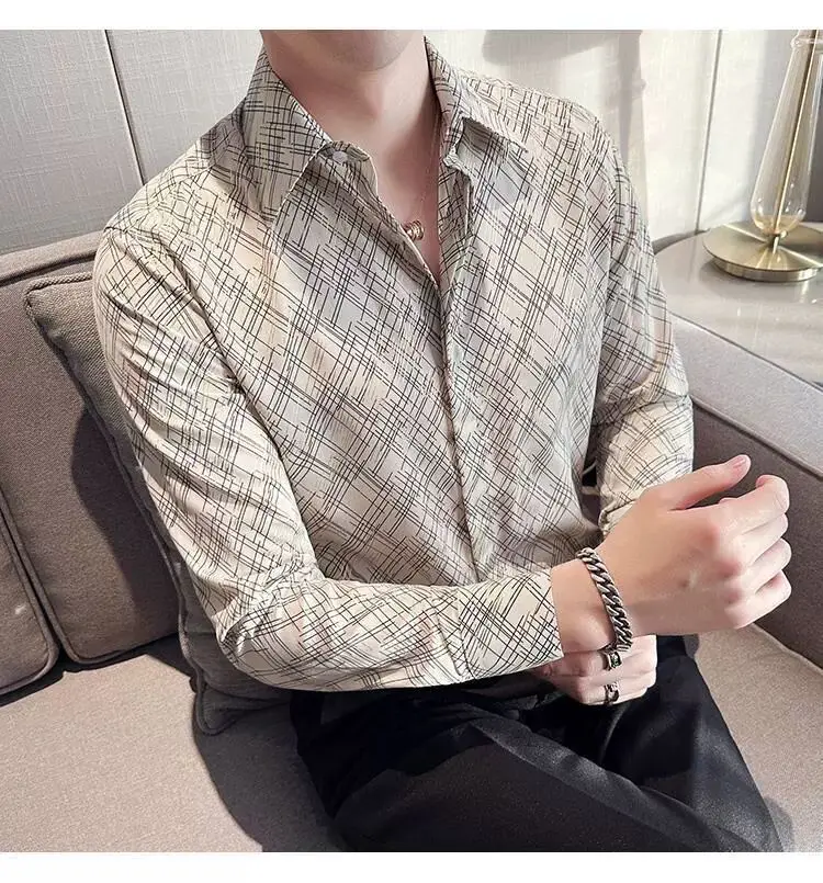 Bonsir Korean Fashion Trend Men Shirts Autumn New Lapel Printing Single Breasted High Street Casual Office Social Long Sleeve Slim Tops