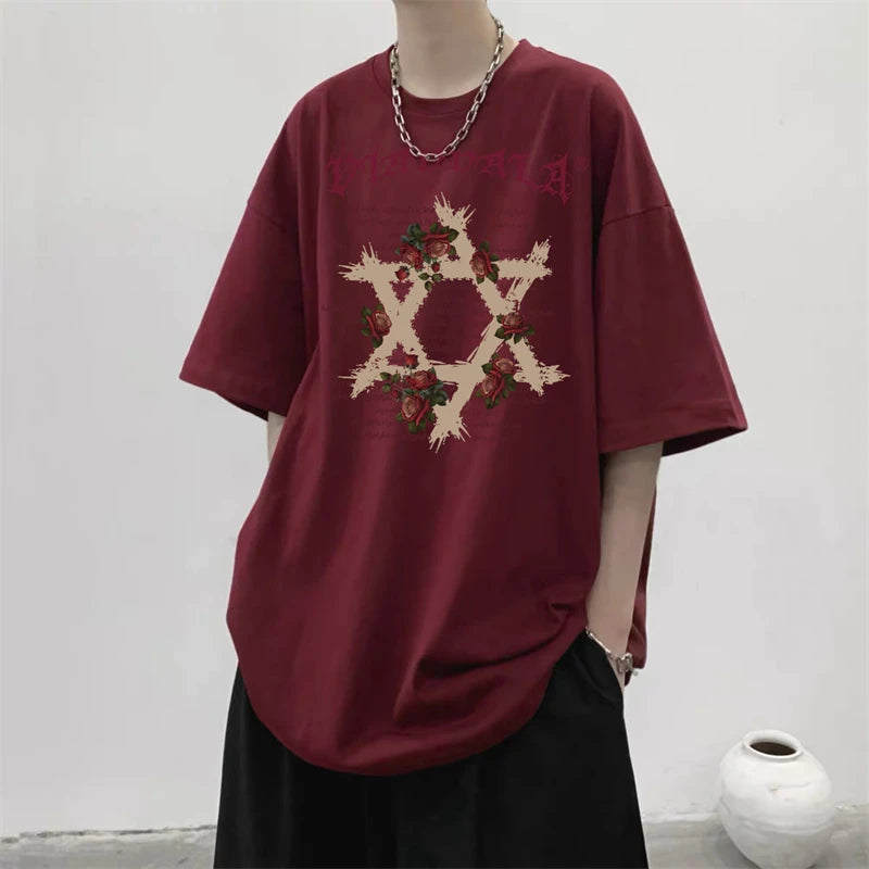 Bonsir Men Clothing 2024 Summer Trendy Letter Floral Print Tees Short Sleeve Oversize Y2K Harajuku T-shirt Youth Casual Streetwear Tops