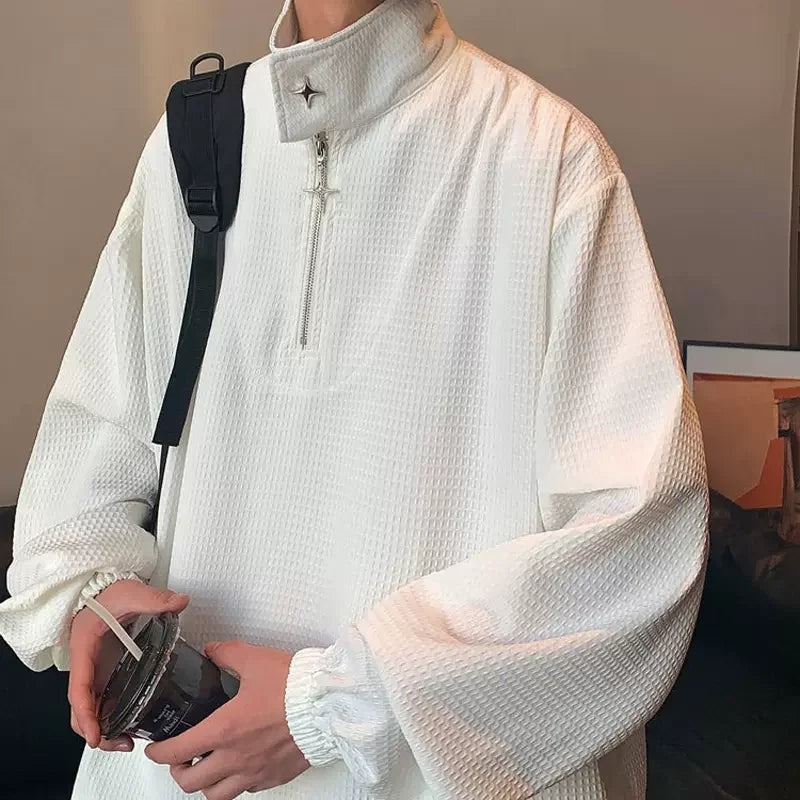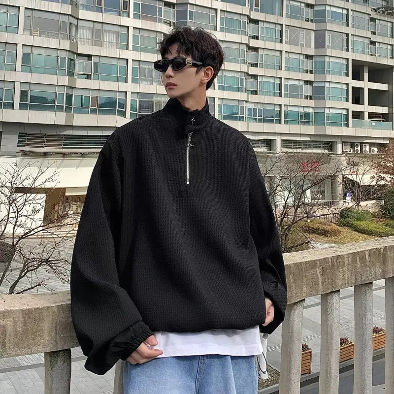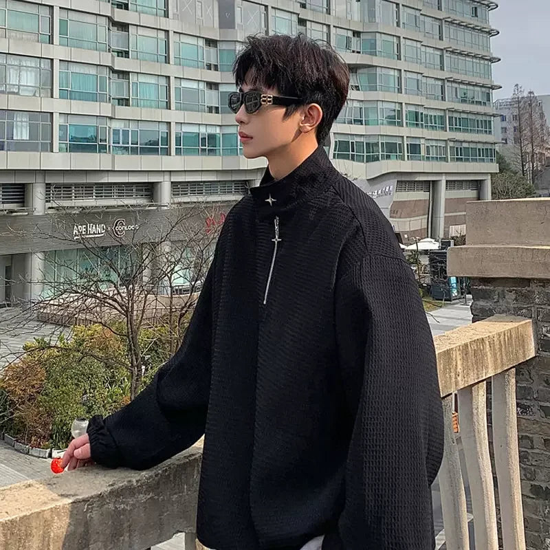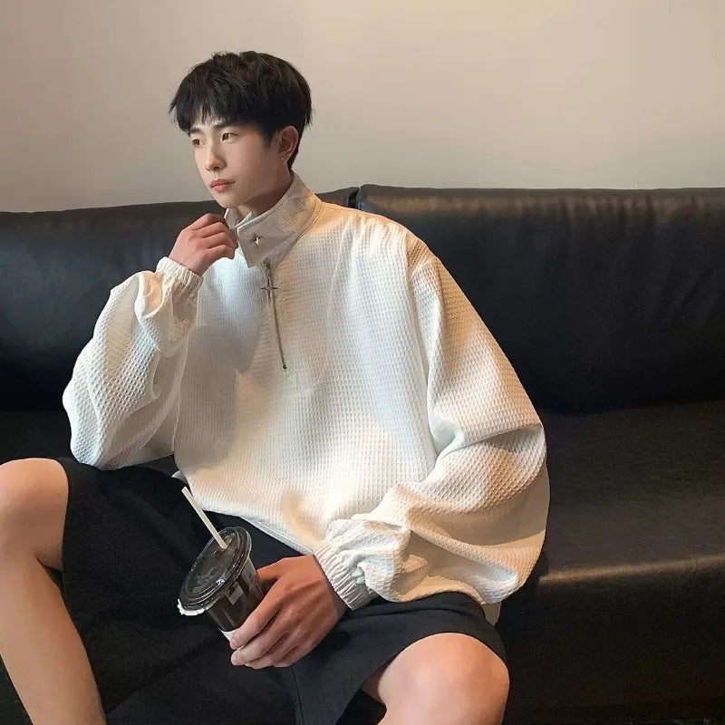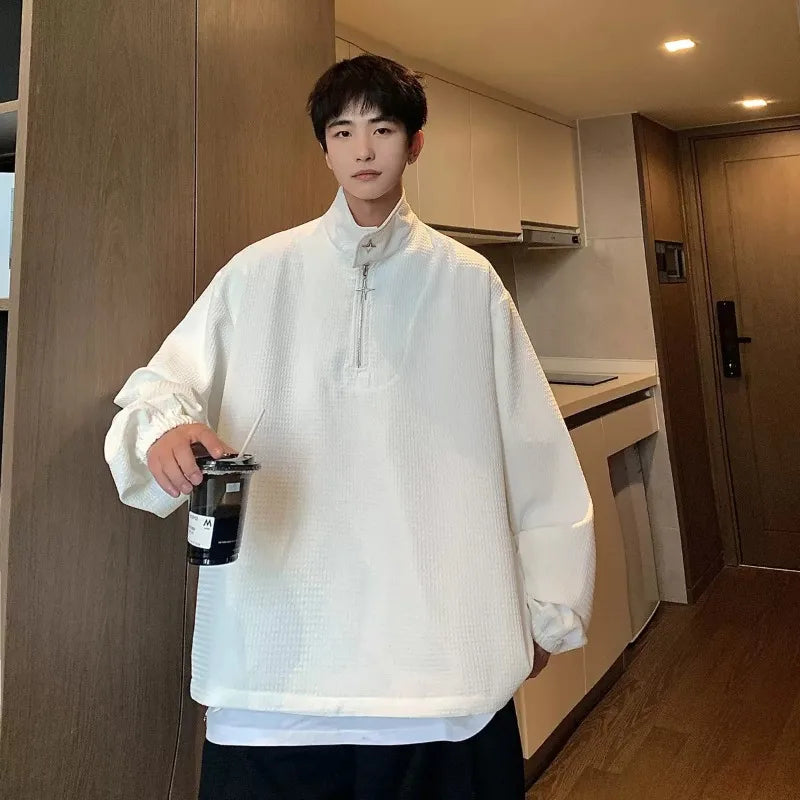 Bonsir Men Trend Stand Collar Oversize Streetwear Half Zipper Waffle Sweatshirt Y2K Simple Casual Long Sleeve Black White Pullover Tops