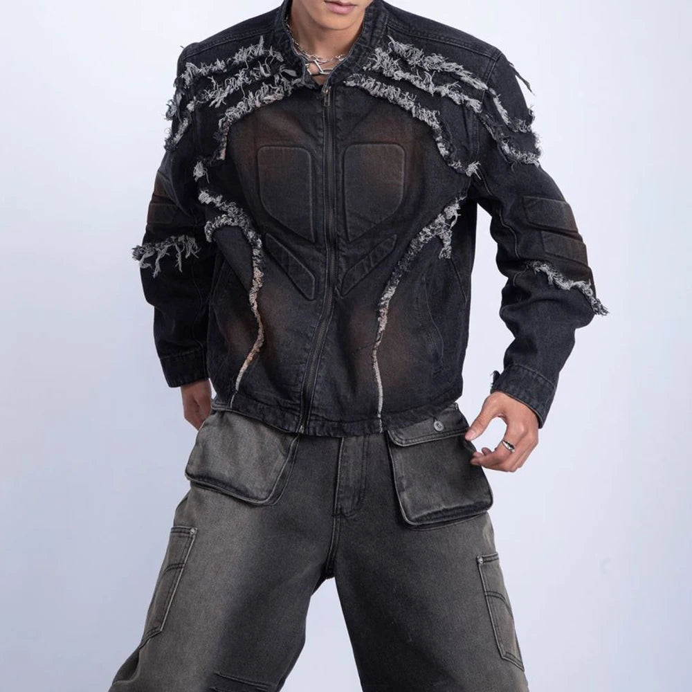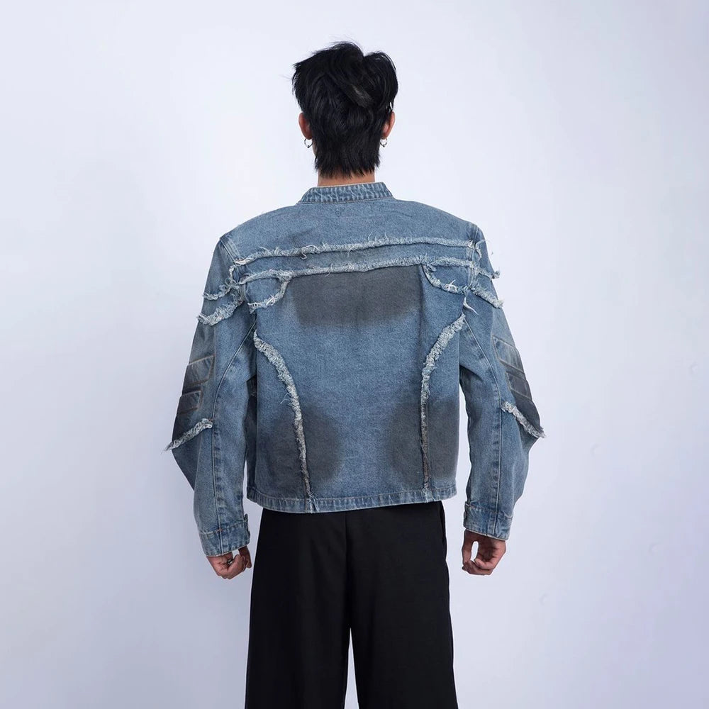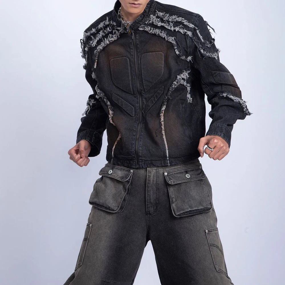 Bonsir Mens Biker Tassel Raw Edge Jacket Autumn Streetwear American Retro Personality Youth Casual Washed Denim Jacket Men'S Clothing