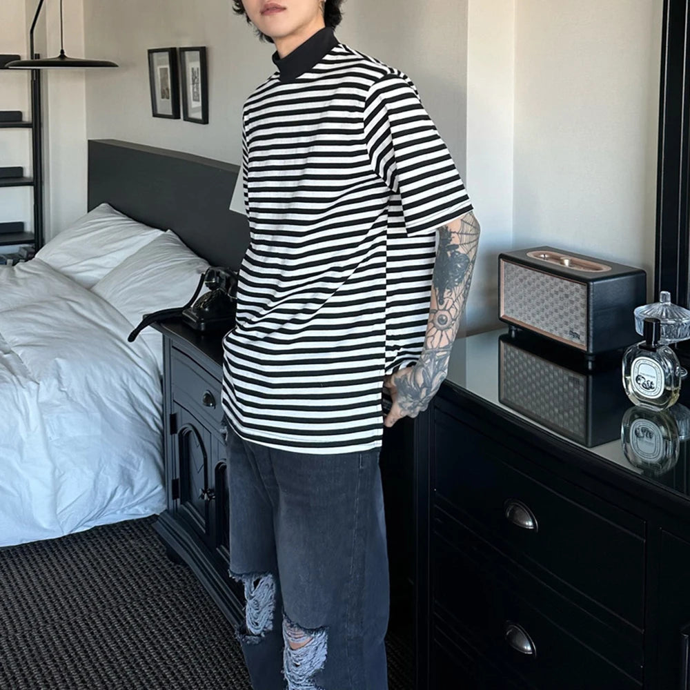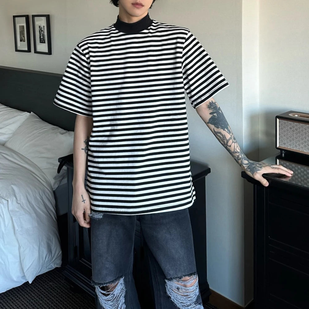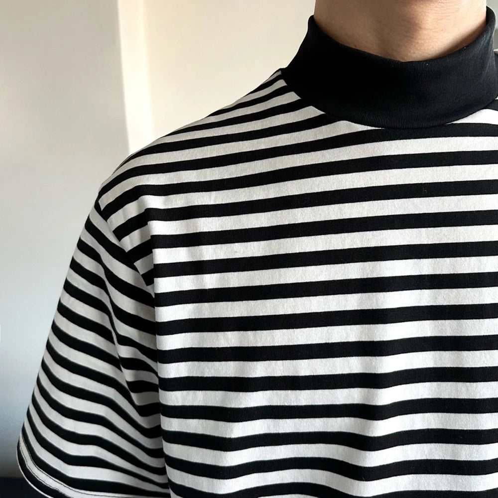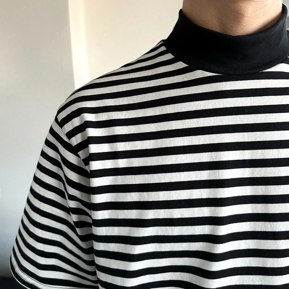 Bonsir Mens Casual Black White Striped T-Shirts Genderless 2024 Summer New Fashion Streetwear Youth High Neck Short Sleeve Tops Unisex