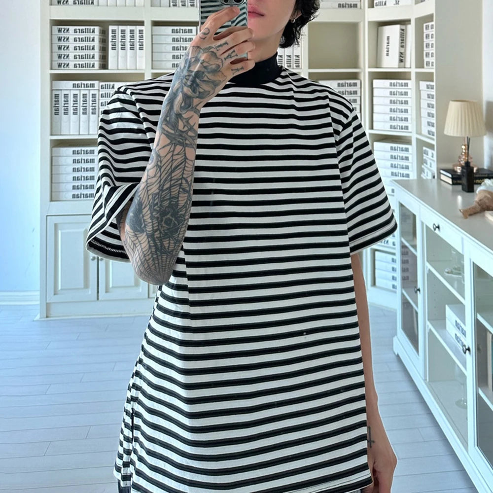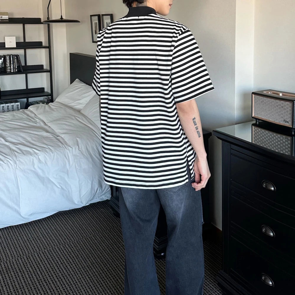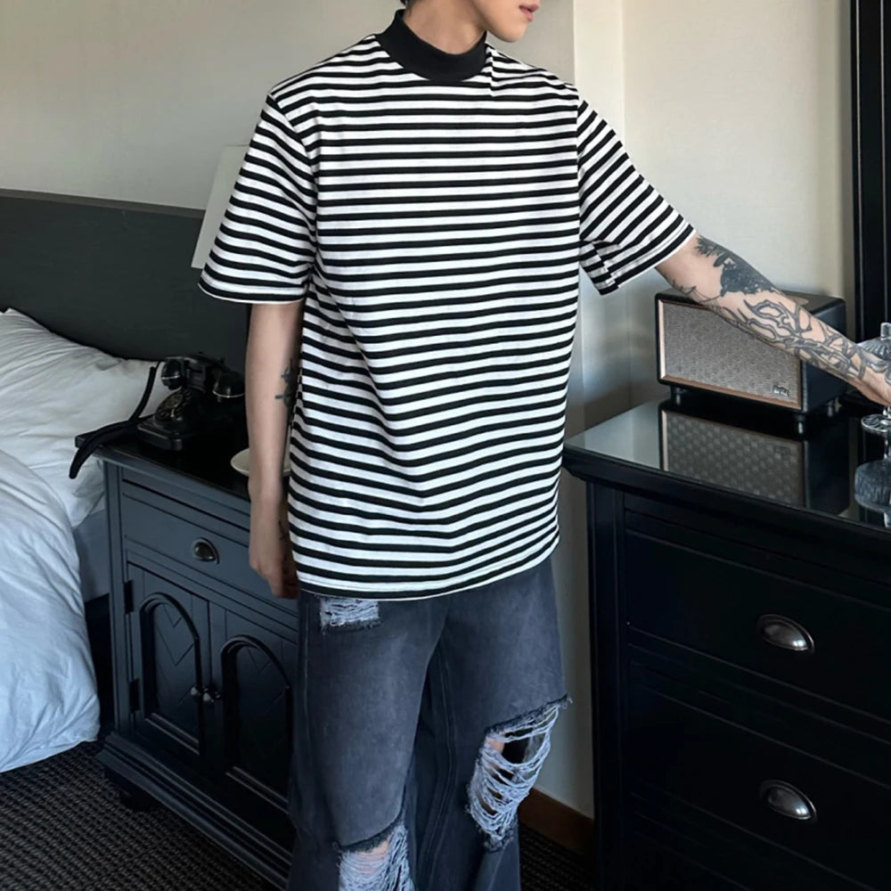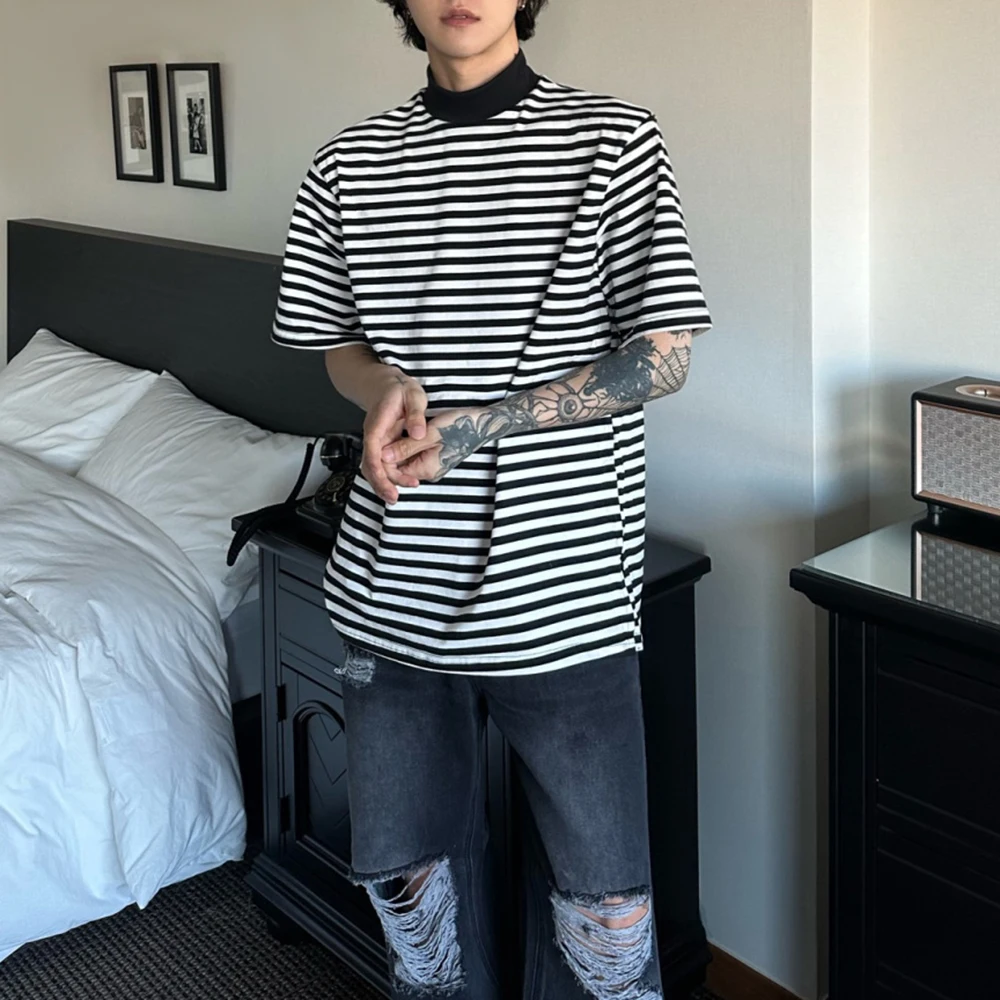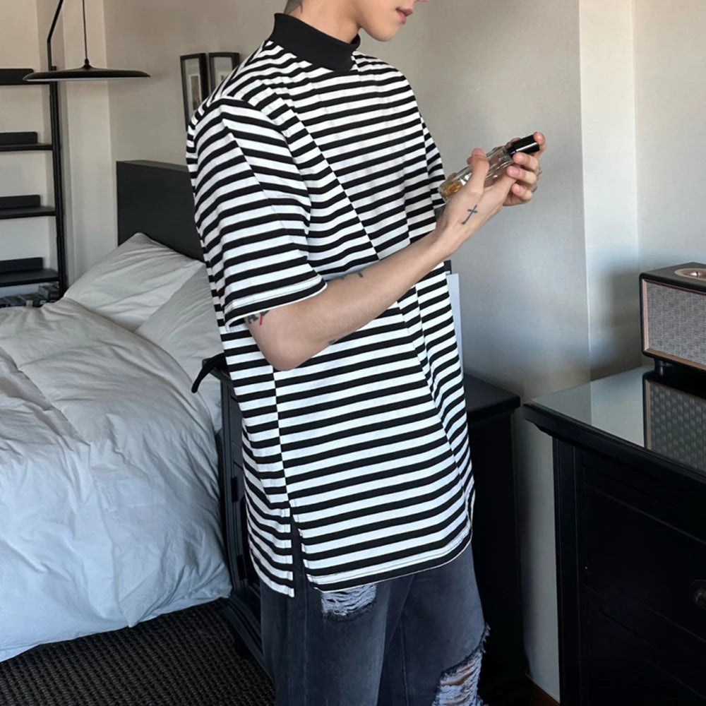 Bonsir Mens Casual Black White Striped T-Shirts Genderless 2024 Summer New Fashion Streetwear Youth High Neck Short Sleeve Tops Unisex