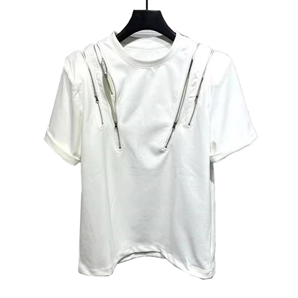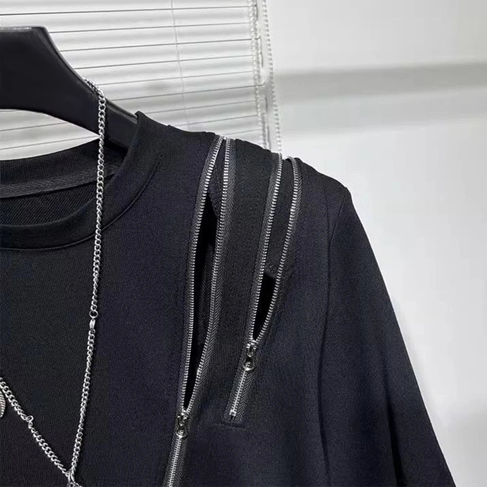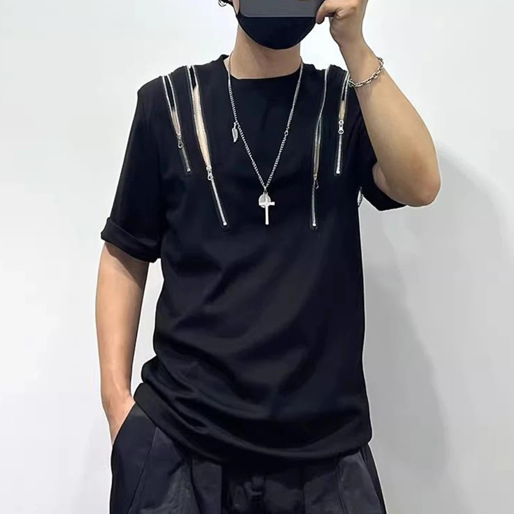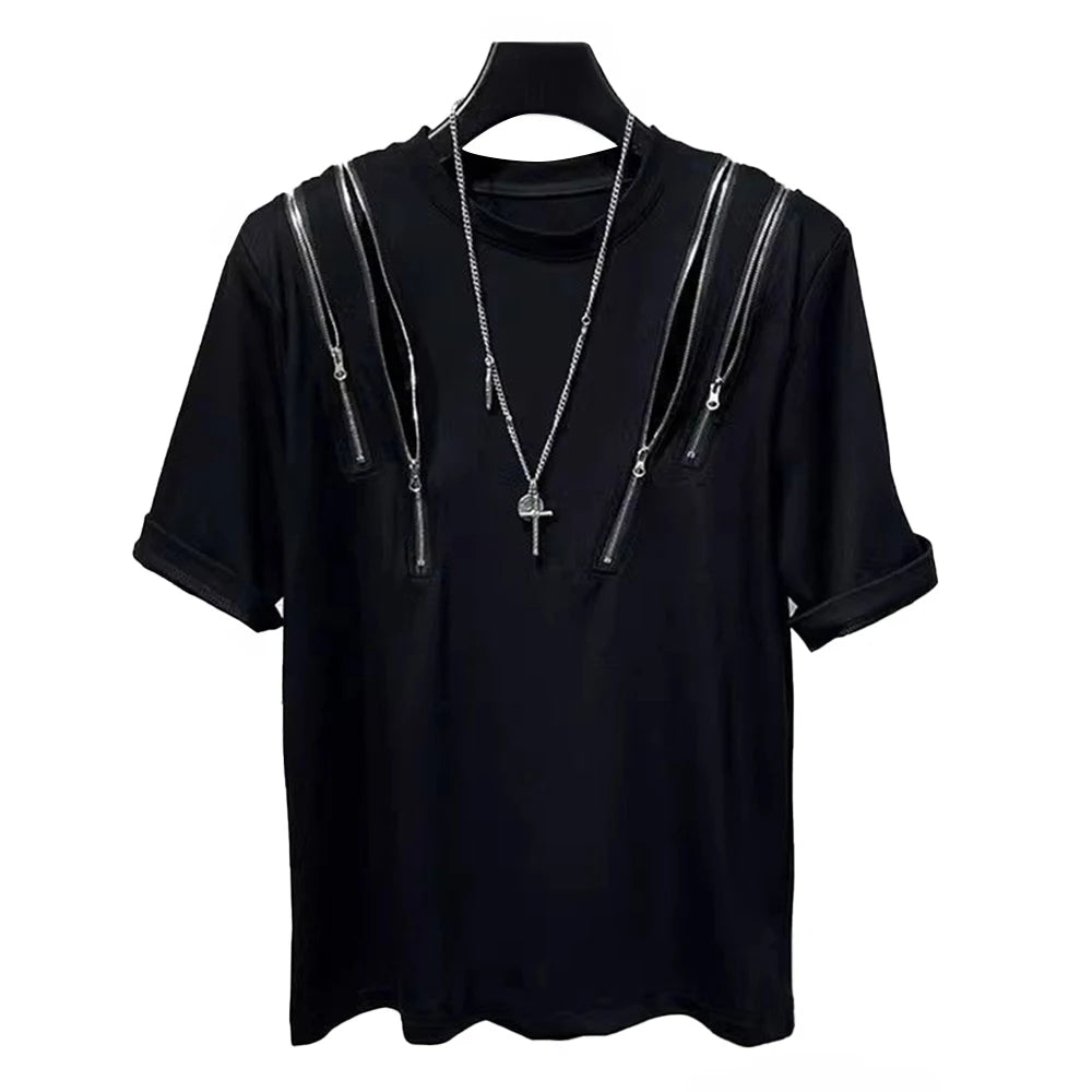 Bonsir Mens Dark Style Hollow Multi-Zipper Splicing T-Shirt New Genderless Youth Streetwear Personality Irregular Top Unisex