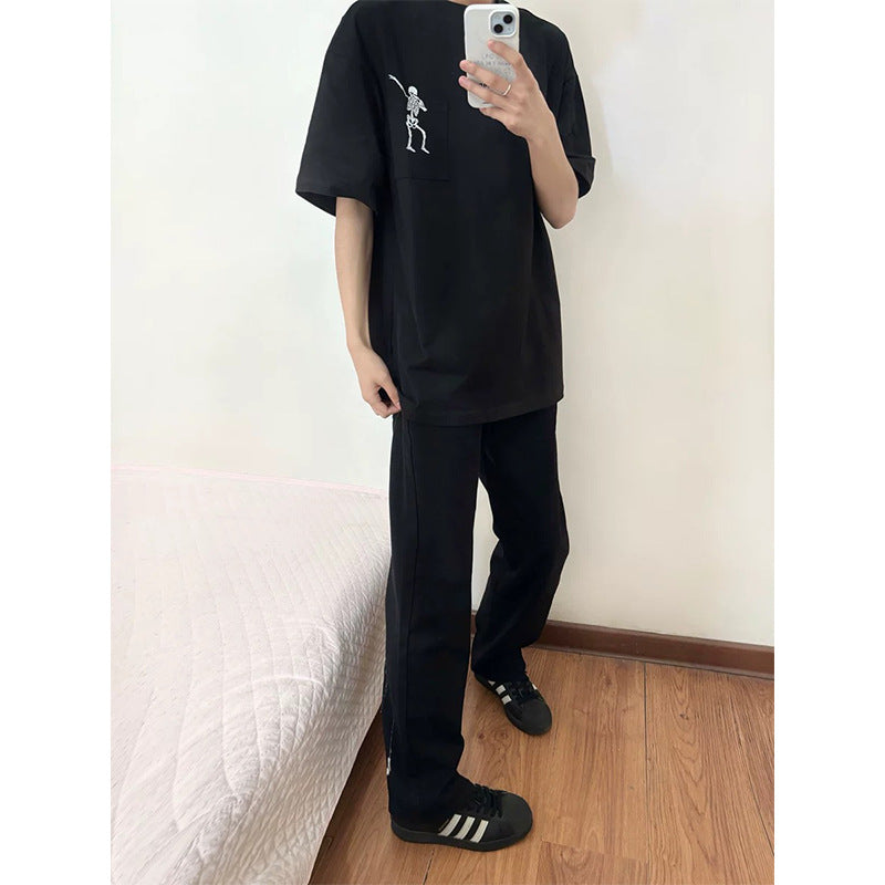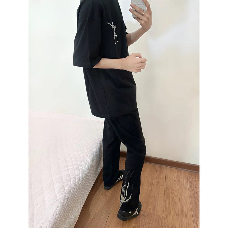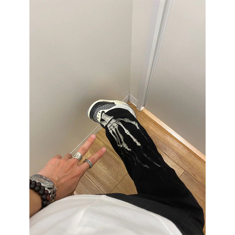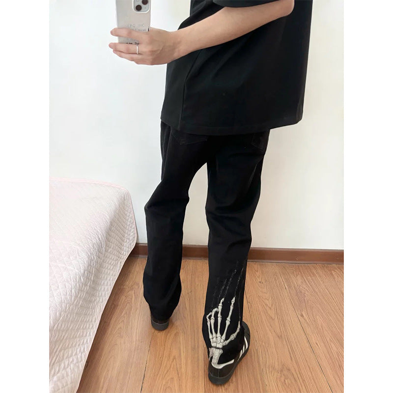 mens fall fashion High Street American Retro Vibe Pants Skull Printed Jeans Men's Slim Straight Flared Pants