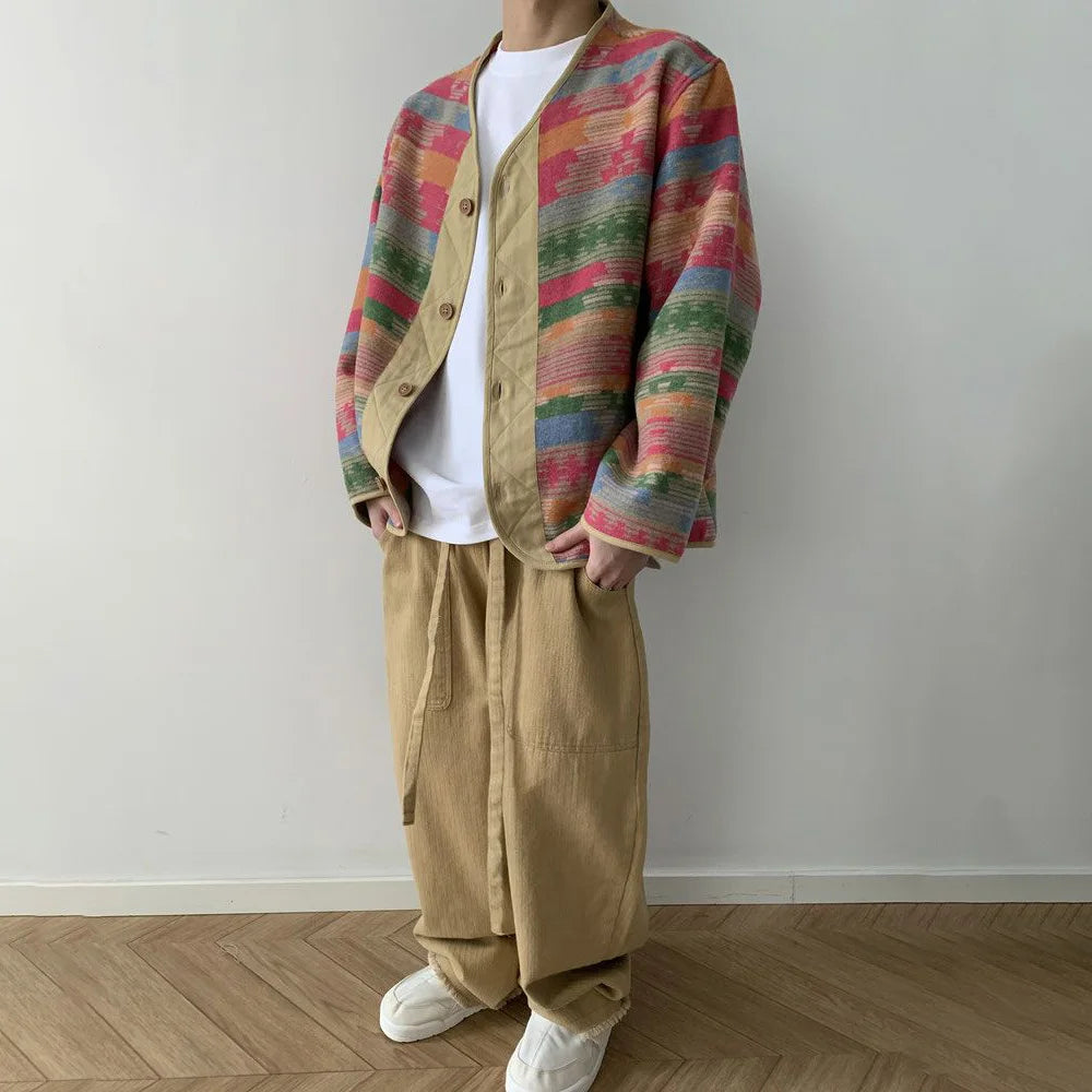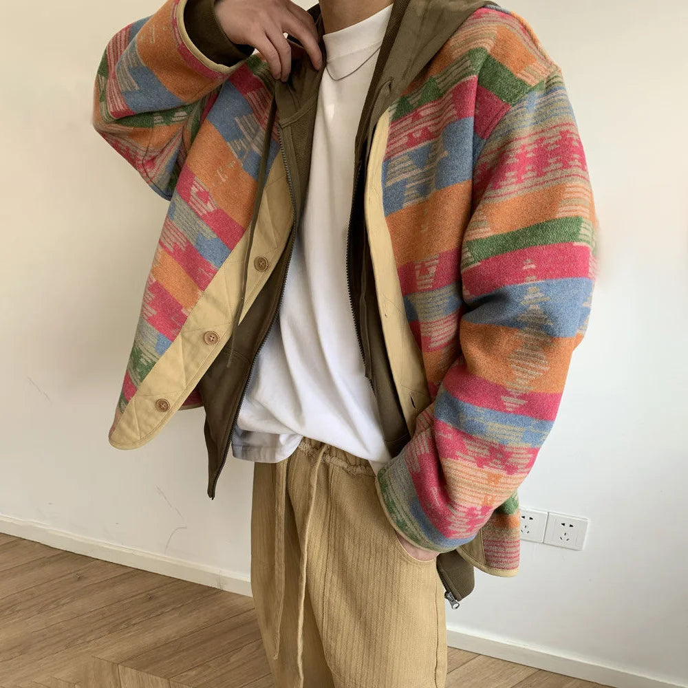 Bonsir Mens Jacket Rainbow Stripes Contrast Color Casual Jacket Autumn Streetwear Personality Retro Ethnic Jacket Men'S Clothing