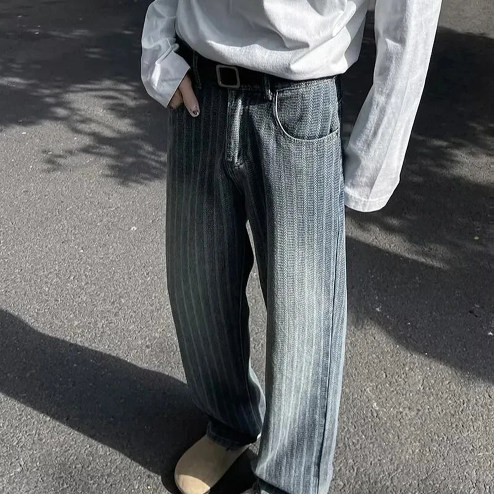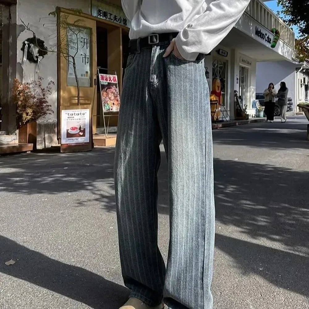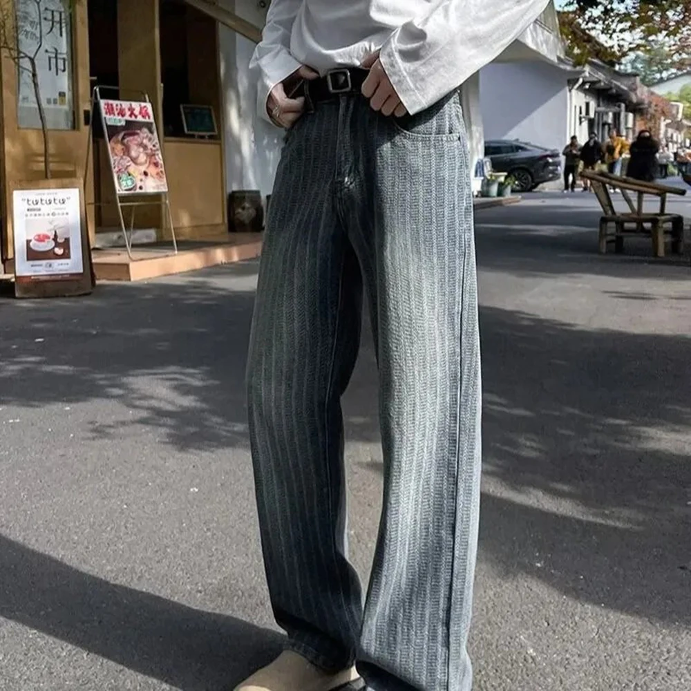 BONSIR - Mens Jeans Contrast Stripes Washed Casual Pants Streetwear American Retro All-Match Daily Straight Pants Men'S Clothing 2025 New