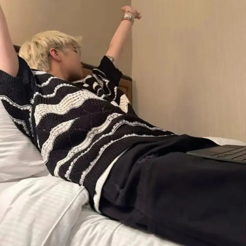 Bonsir Mens Knitted T-Shirt Black White Contrast Striped Top Streetwear Hollow Versatile Casual Short-Sleeve Tshirt Men'S Clothing