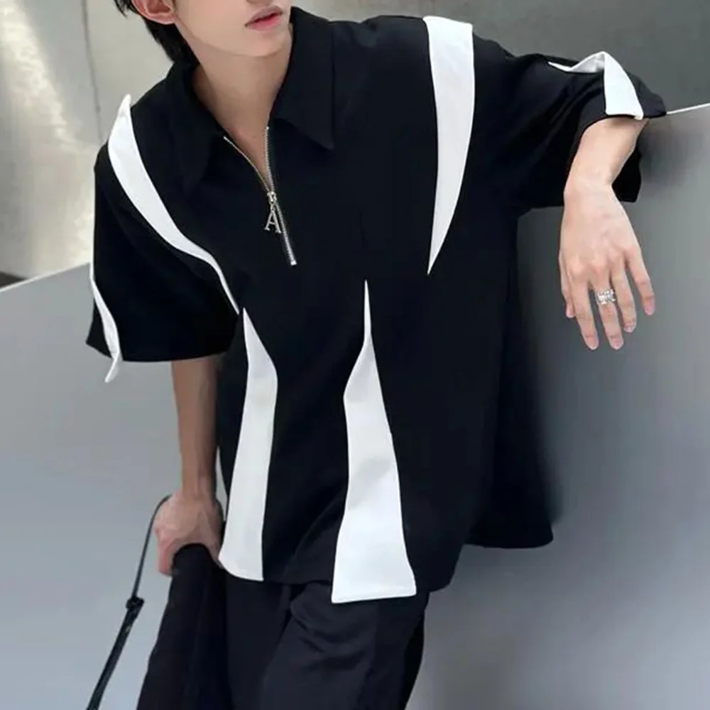 Bonsir Mens Polo Shirt Y2k Black White Contrast Half-Zip T Shirt Fashion Casual Personality Streetwear All-Match Tops Men'S Clothing