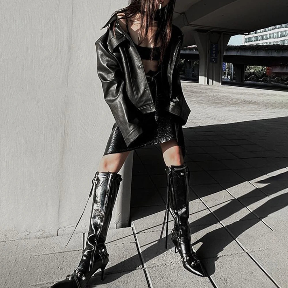 Bonsir Mens Pu Jacket Motorcycle Pocket Pu Leather Jacket Spring Streetwear Fashion Harajuku Grunge Coat Old Money Men'S Wear New