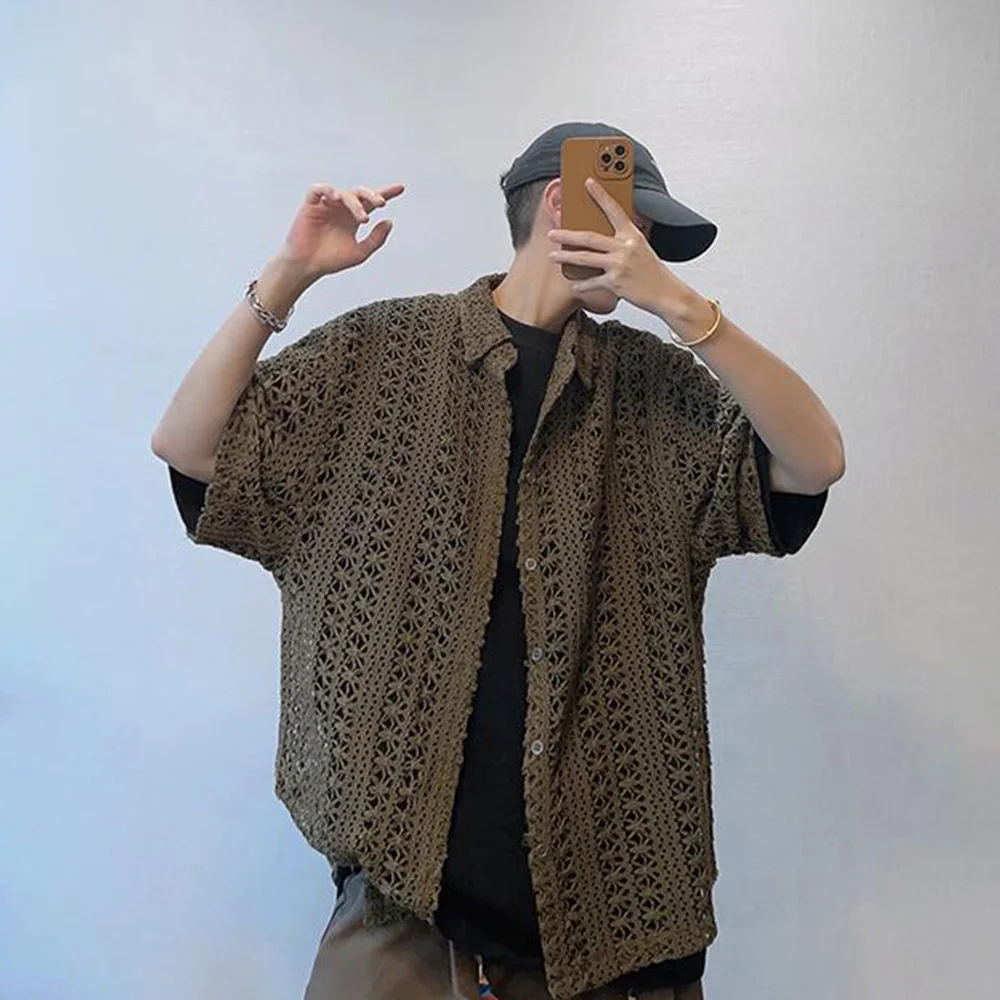 Bonsir Mens Shirts Floral Hollow Hidden Buttonhole Shirts Summer Streetwear Elegant Beach Vacation Short Sleeve Tops Men'S Clothing