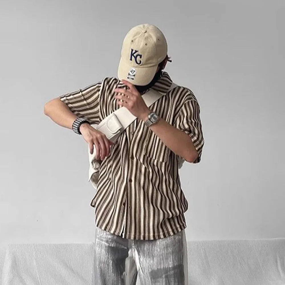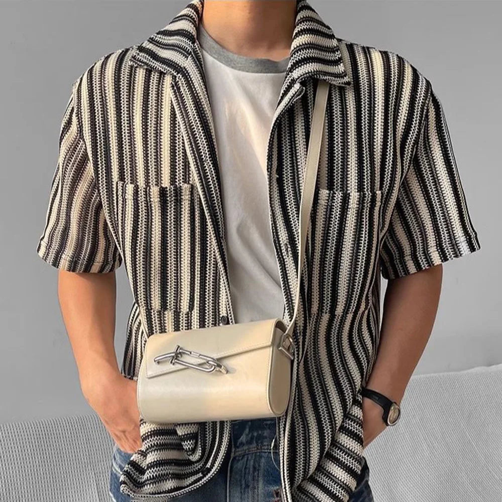 Bonsir Mens Shirts Striped Knitted Casual Tops Streetwear Fashion Beach Vacation Camping Short Sleeve Shirts Men'S Clothing Summer