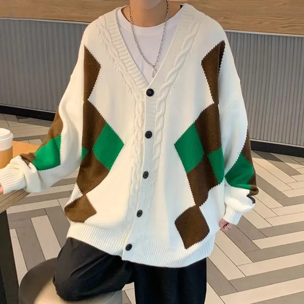 Bonsir Mens Sweater Diamond Plaid Contrast Color Casual Knit Tops Streetwear Campus Designer Couple Valentines Cardigan Unisex New