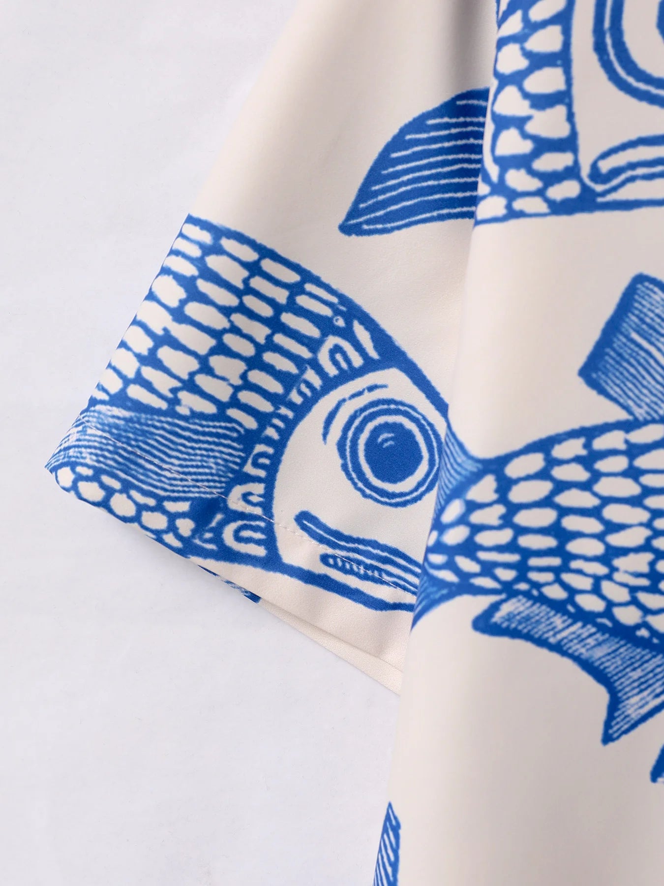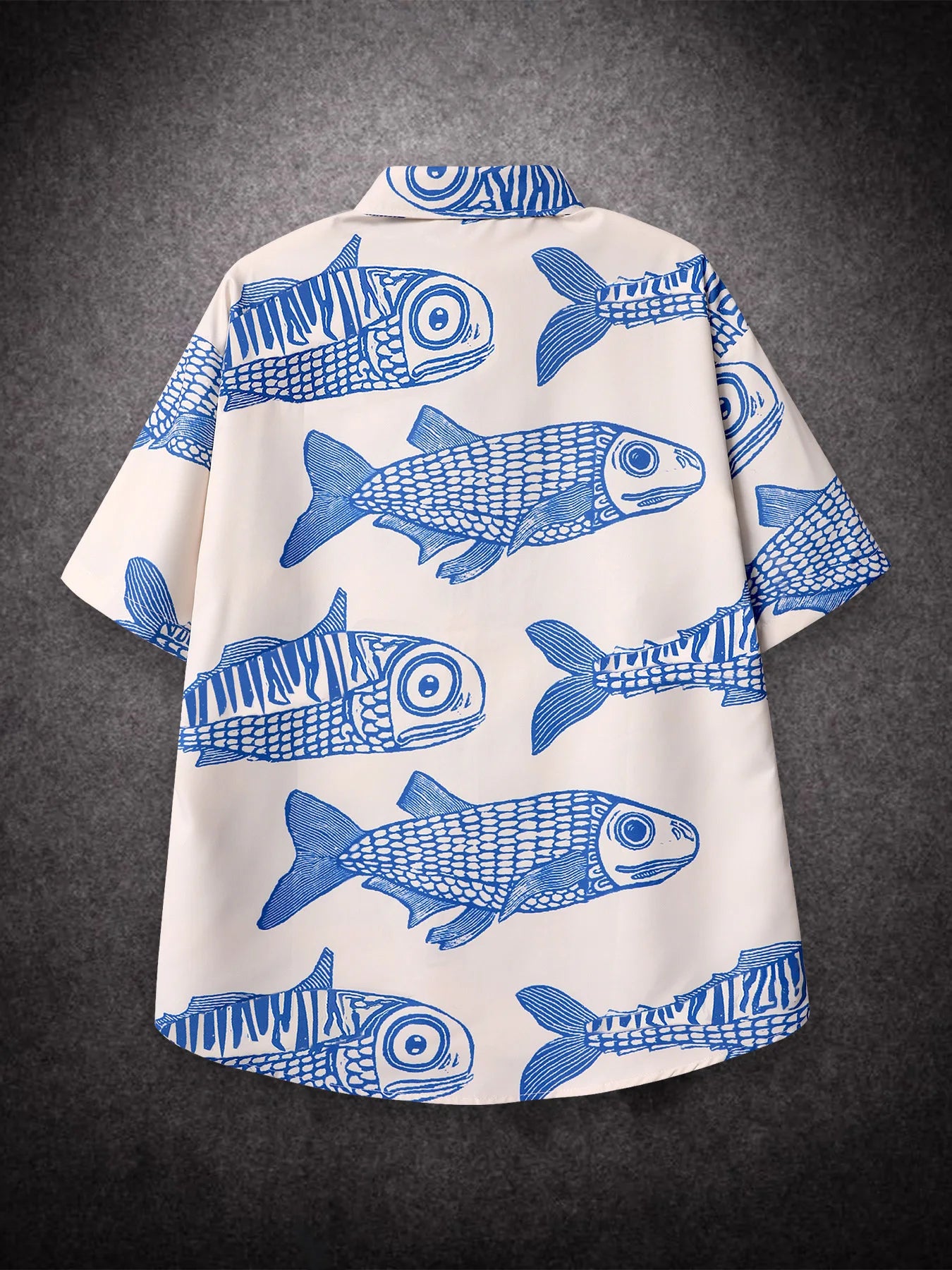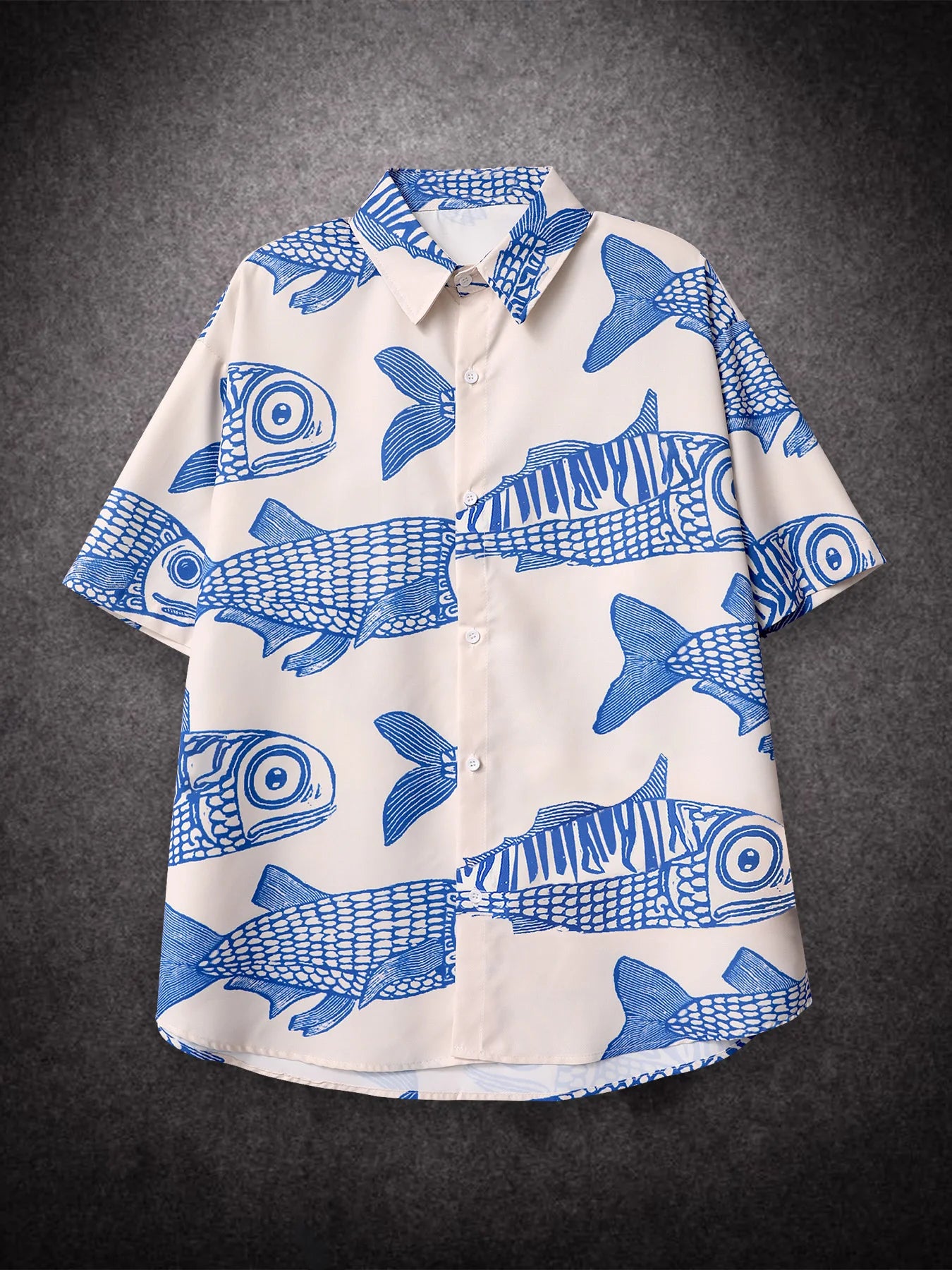 Bonsir Oversized Loose Men Shirt American Style Summer Fried Street Fashion Small Fish Print New Personalized Mens Casual Shirts