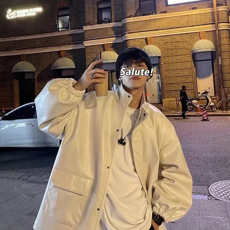 Bonsir Pu Leather Jacket Men's Personalized Fashion Street Biker Wind Jacket Spring and Autumn Loose Lapel Top Clothes Men Clothing