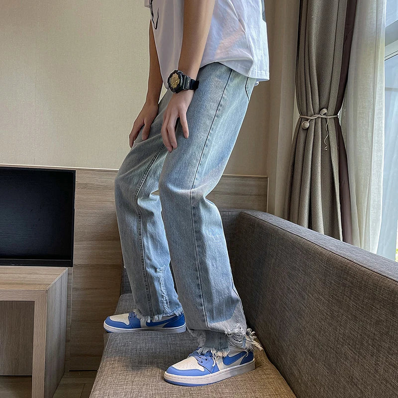 Bonsir Ripped jeans men's loose straight chic summer thin casual pants with raw edges Monkey Wash high street hip-hop wide-leg pants