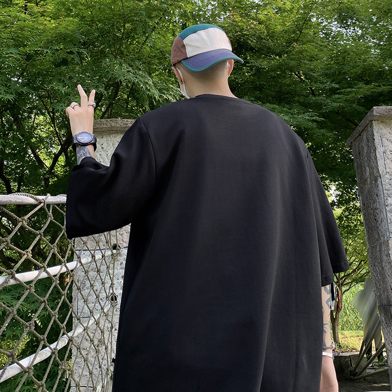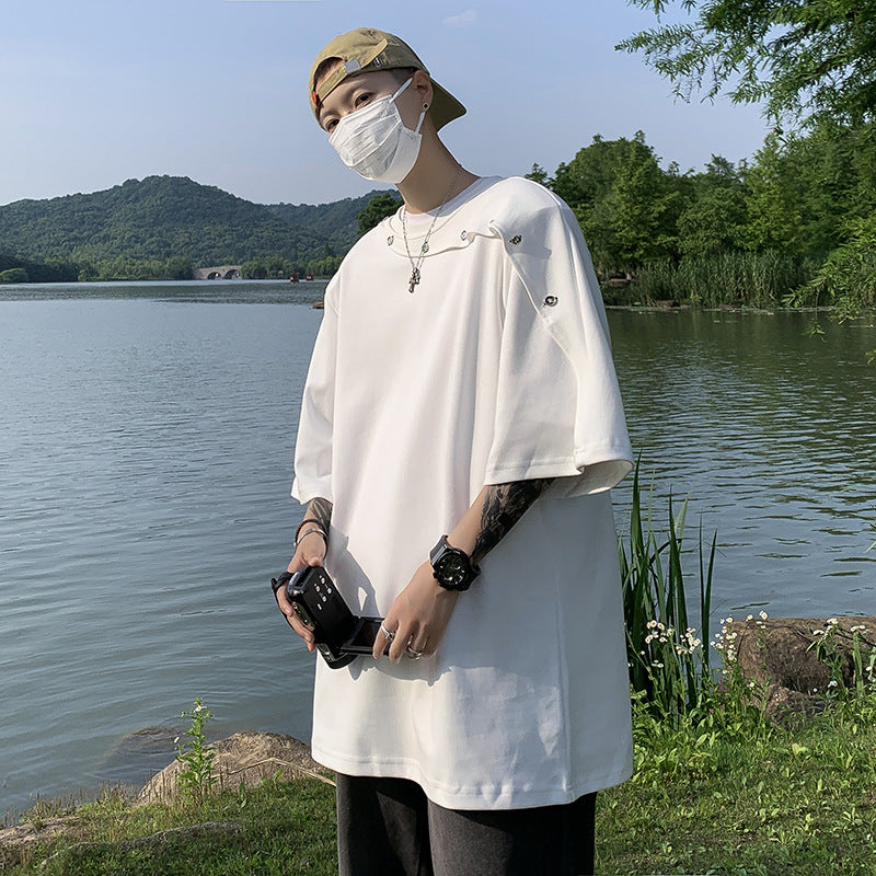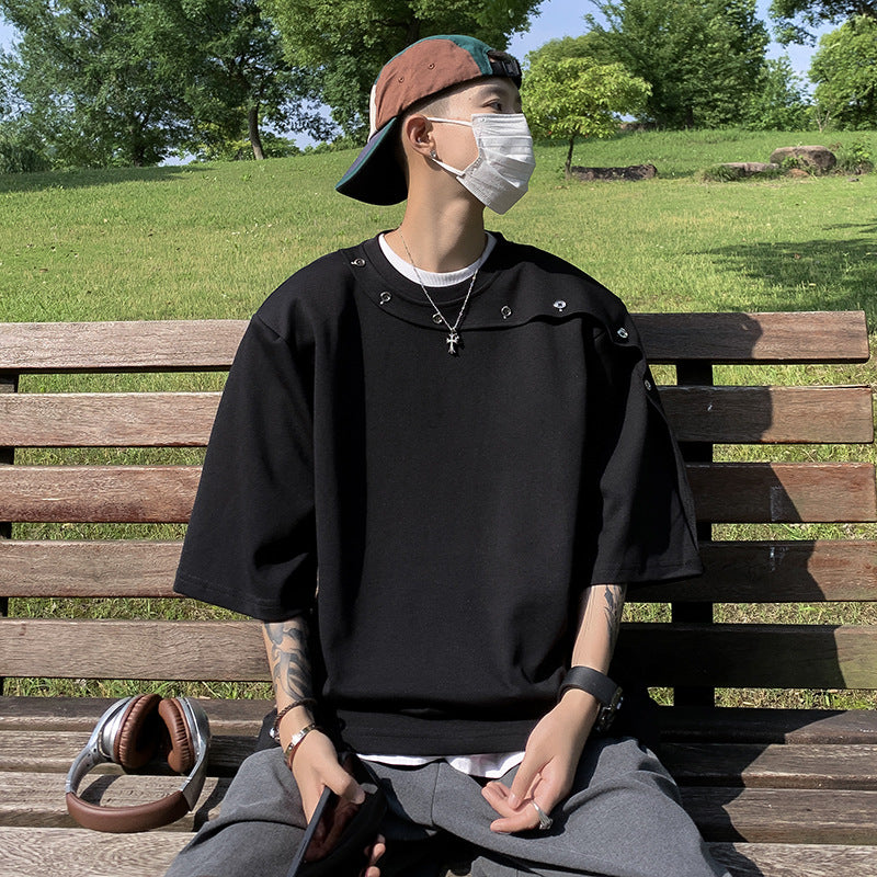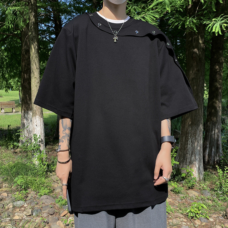 semi formal men outfit Summer Stitching Button Short Sleeve T-shirt Men's Ins High Street Loose All-Match round Neck Half Sleeve T-shirt