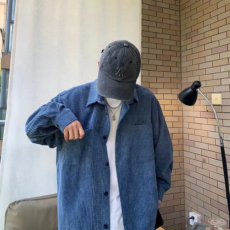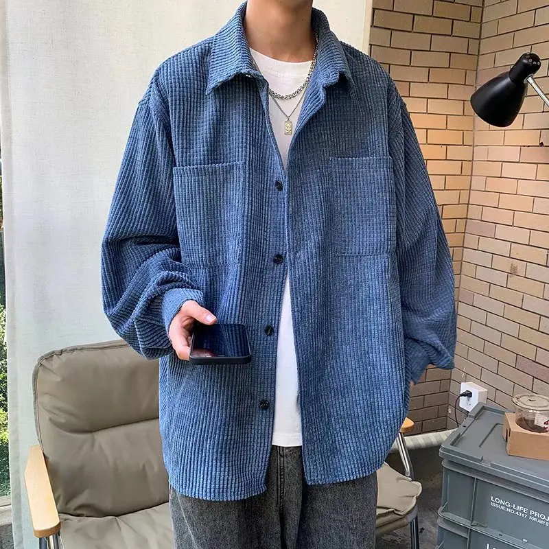 Bonsir Spring Grey/Blue/Black Corduroy Shirt Men Fashion Casual Pocket Shirts Mens Streetwear Korean Loose Long Sleeve Shirt Men M-2XL