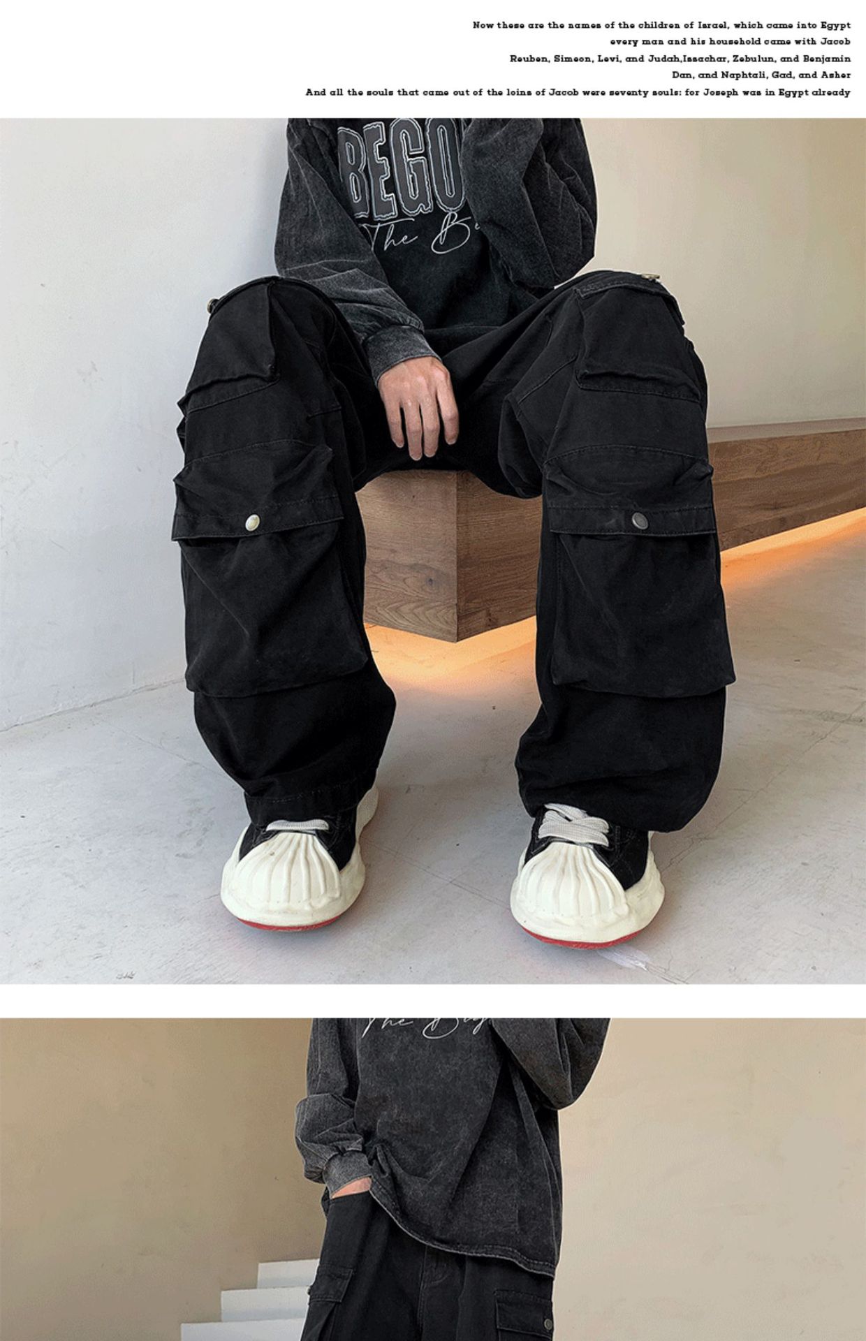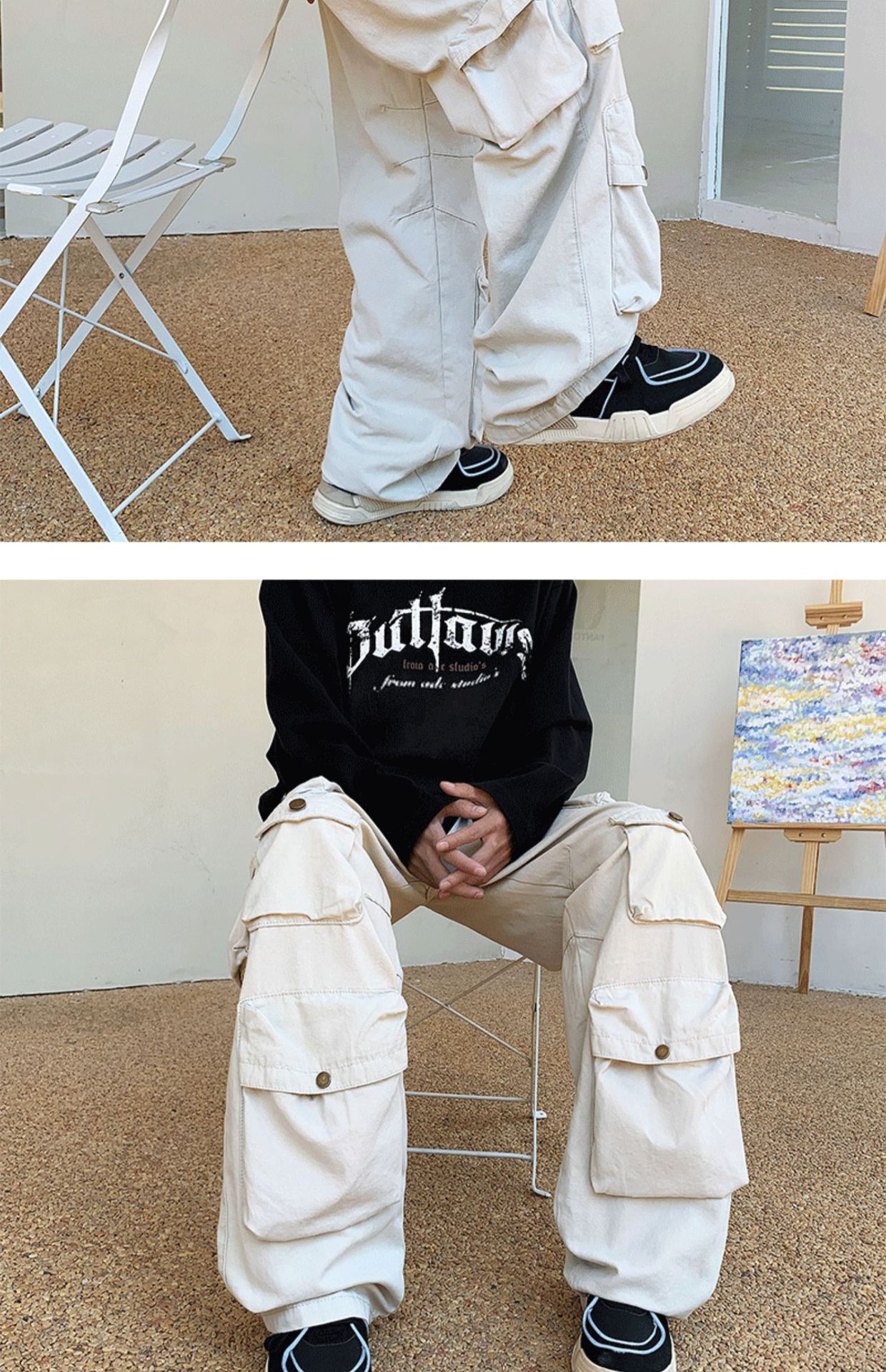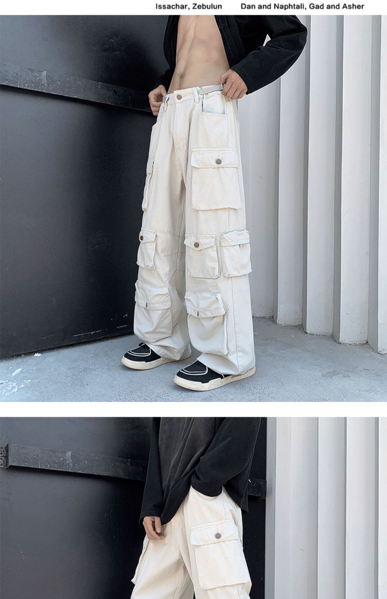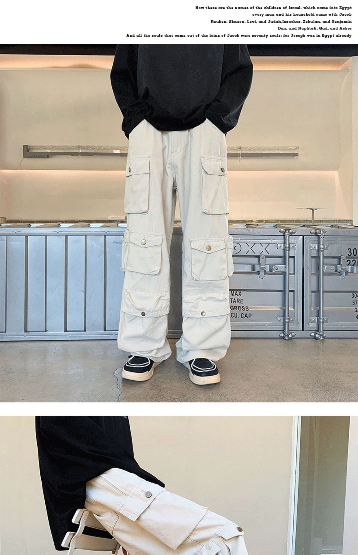 BONSIR - Street Popular White Multi-pocket Overalls Men's Harajuku Style Loose Casual Trousers Straight Mopping Pants Autumn New