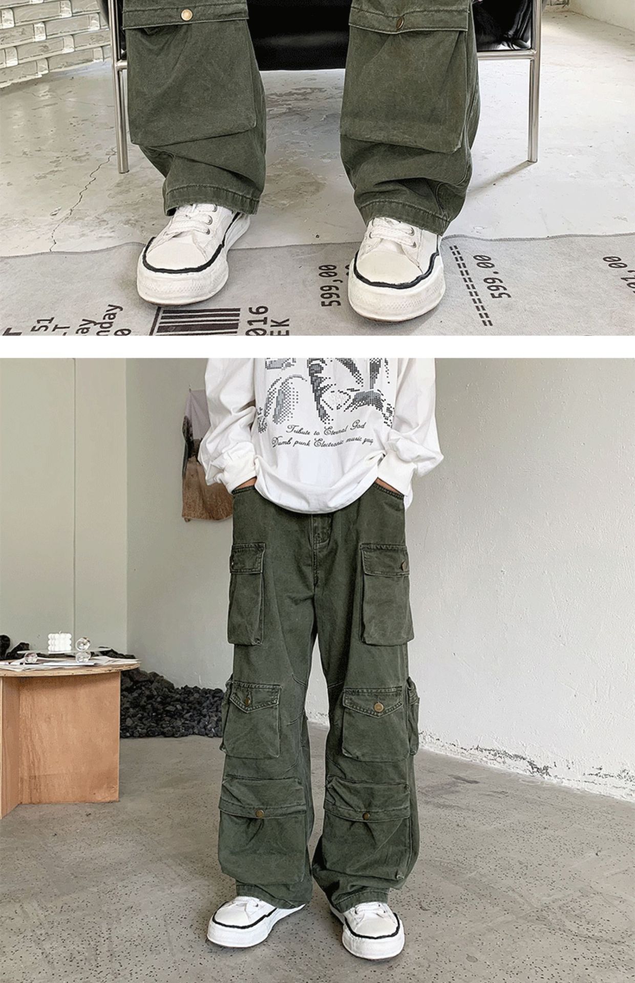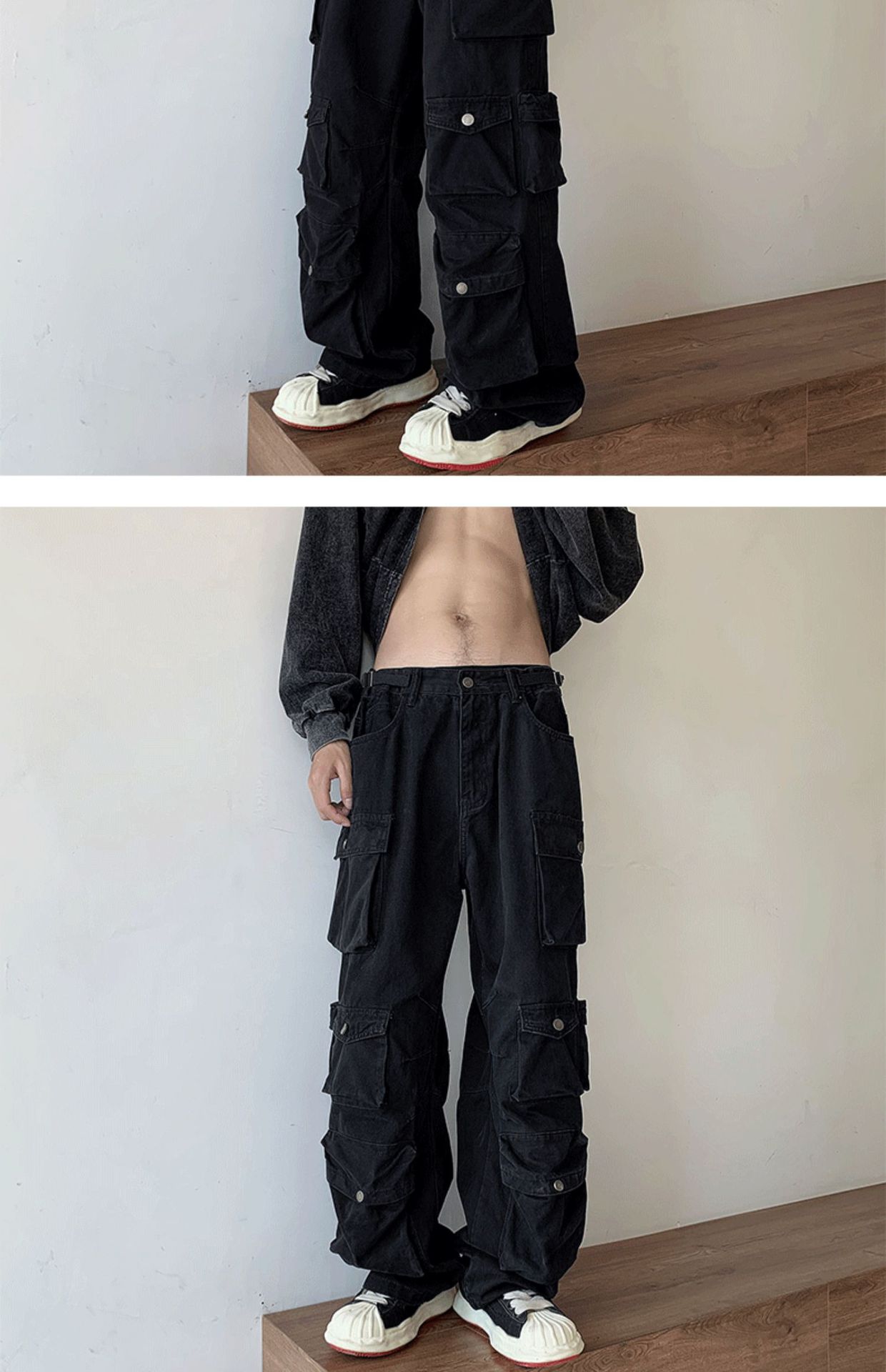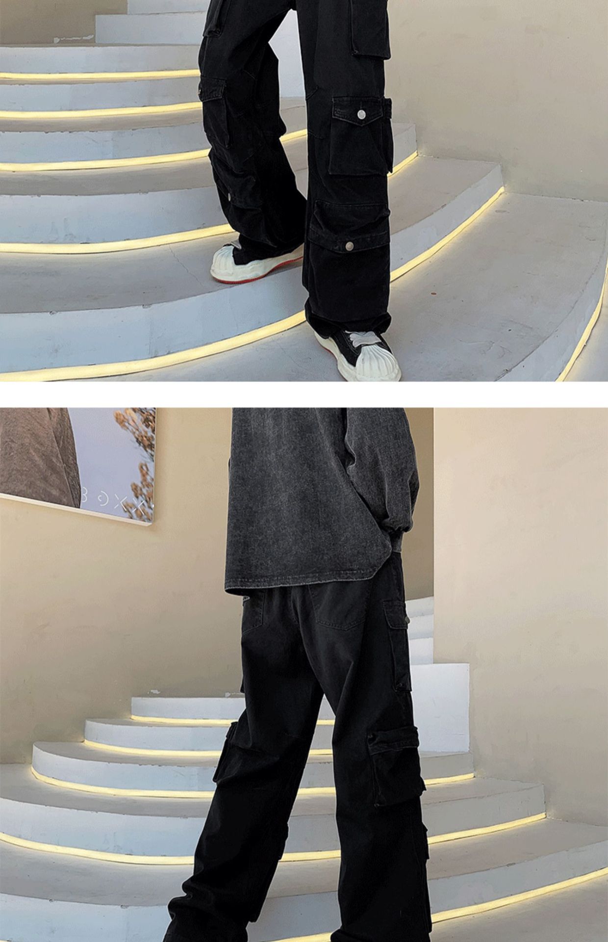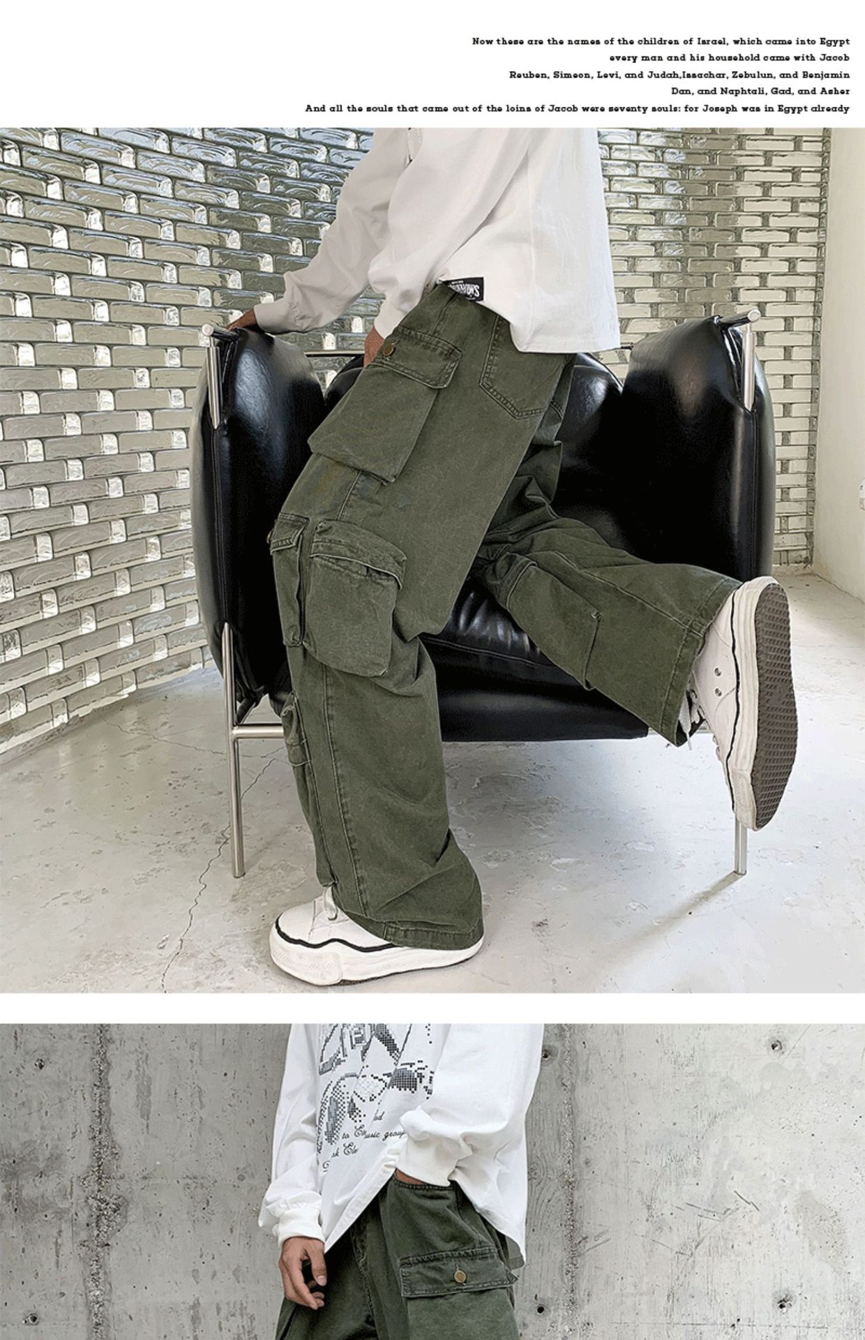 BONSIR - Street Popular White Multi-pocket Overalls Men's Harajuku Style Loose Casual Trousers Straight Mopping Pants Autumn New